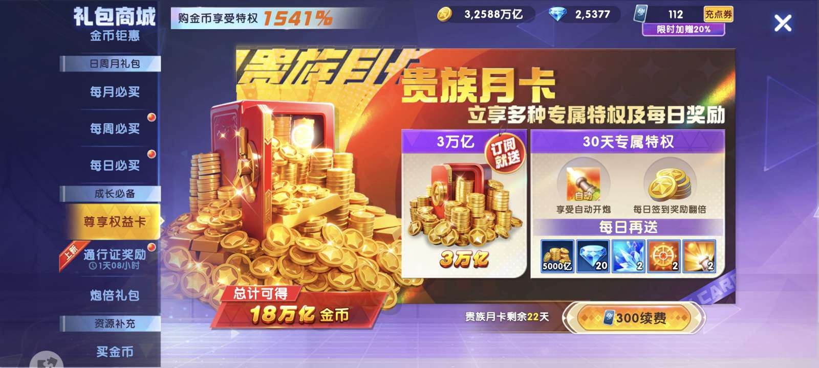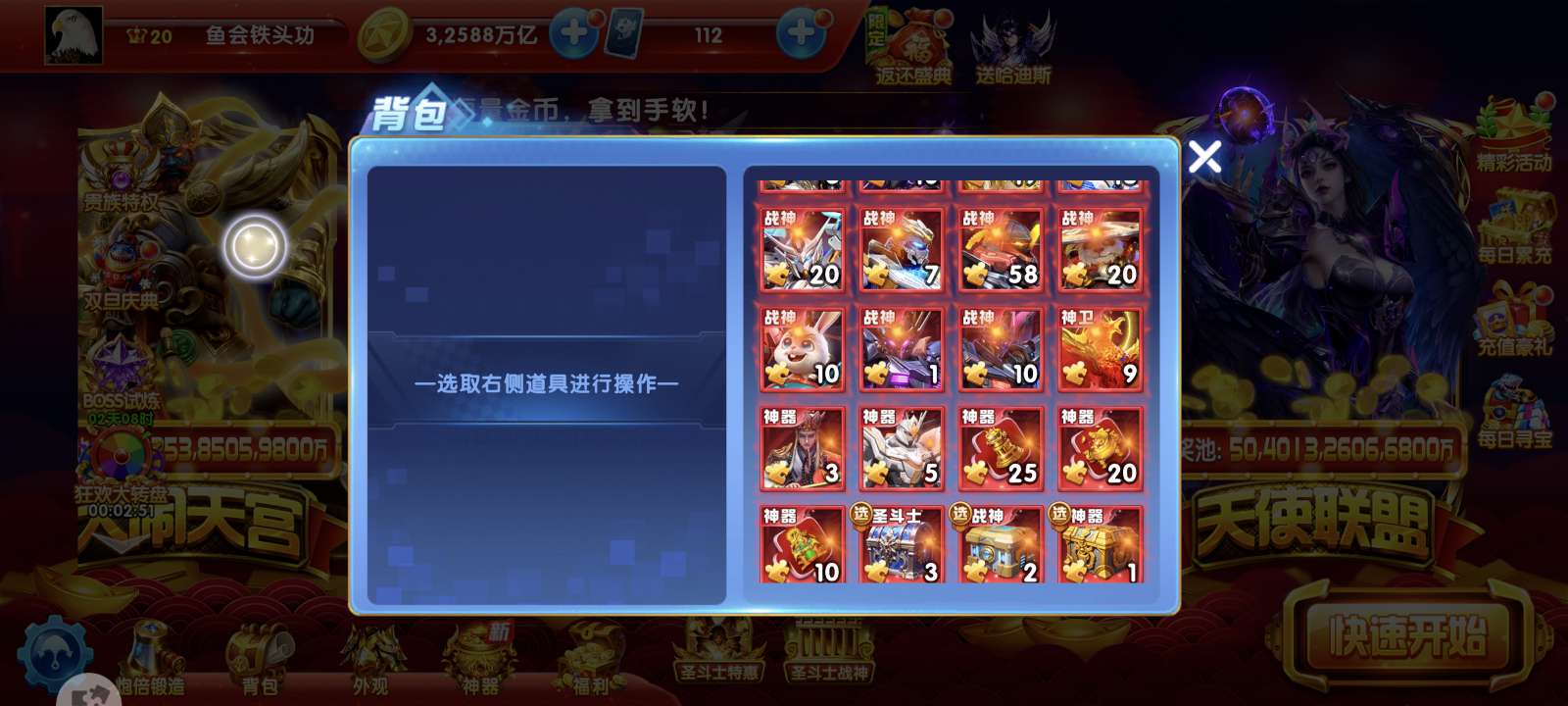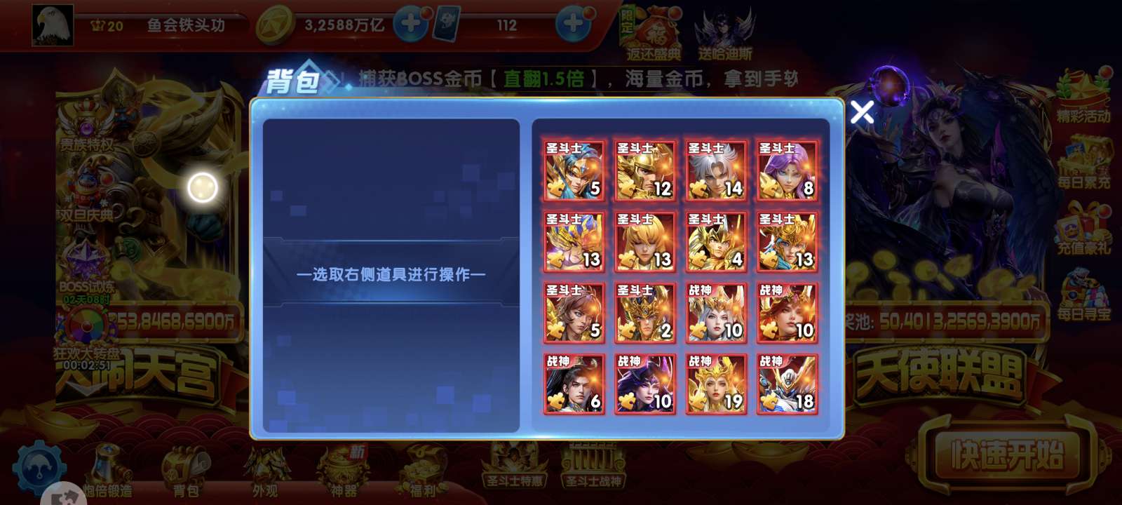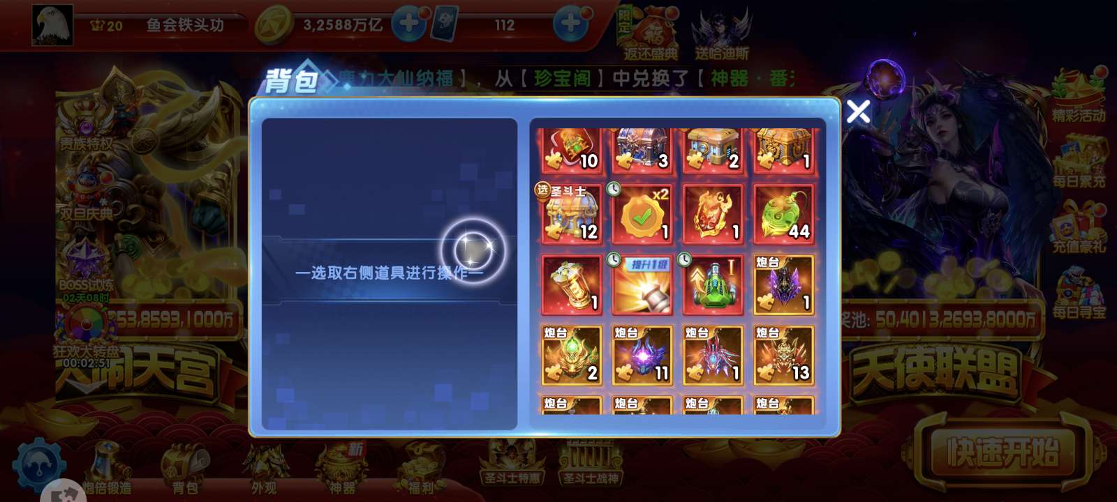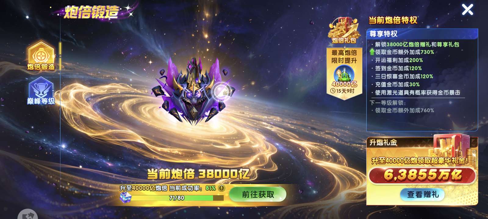 华为捕鱼大作战v20差一千多特权11现在13.5套,背包有一个同步器加成1541,纯救济1.9兆