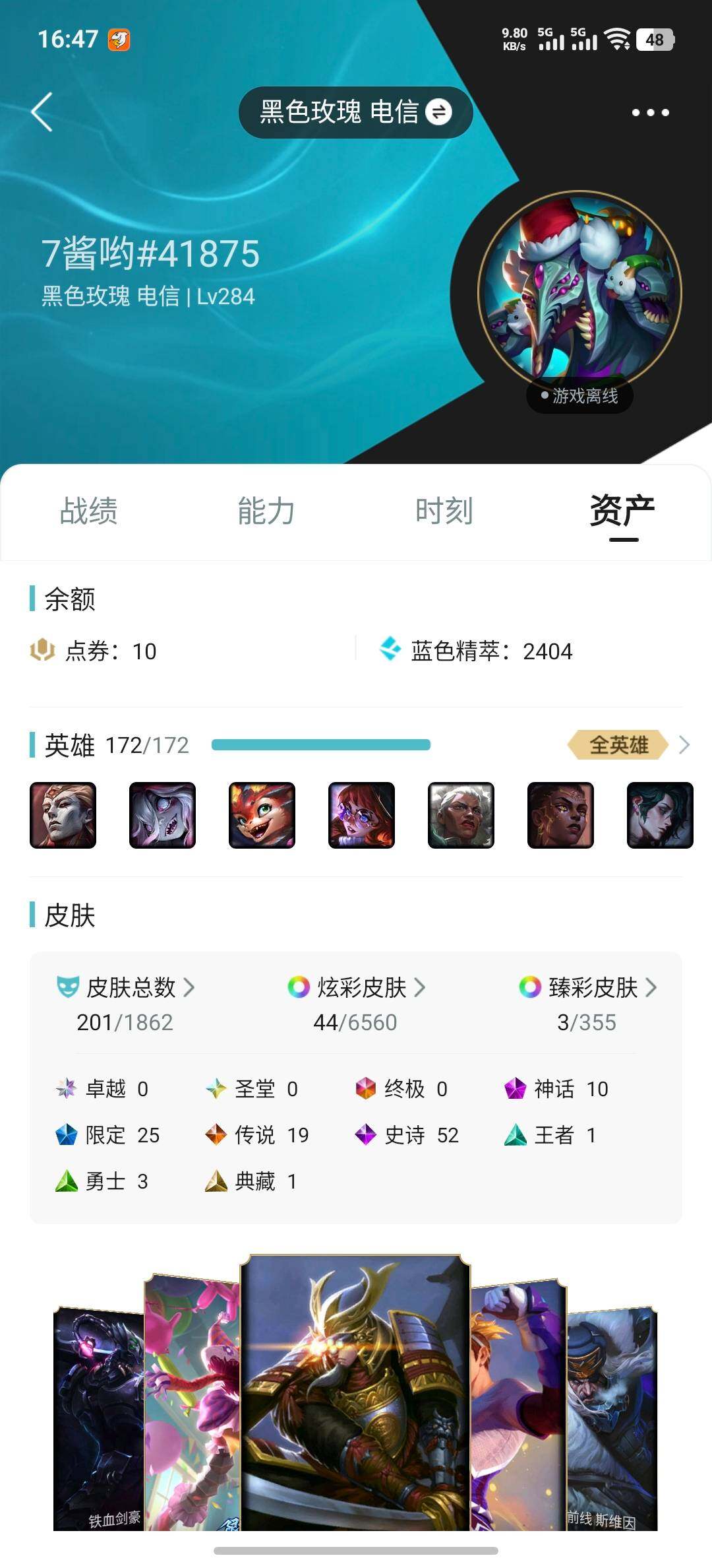 【店主推荐捡漏号!可直接换绑】未定级段位-172英雄-201皮肤-44炫彩-0终极-10神话-25限定-19传说-52史诗