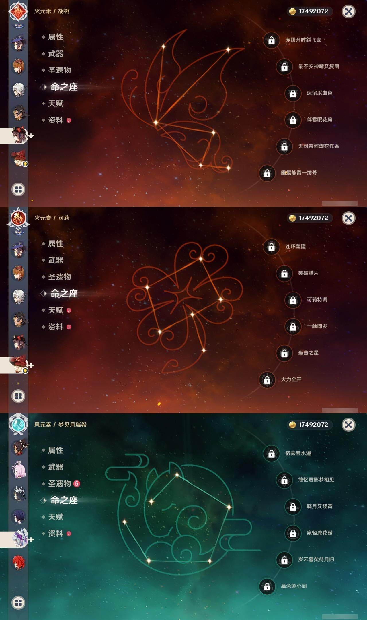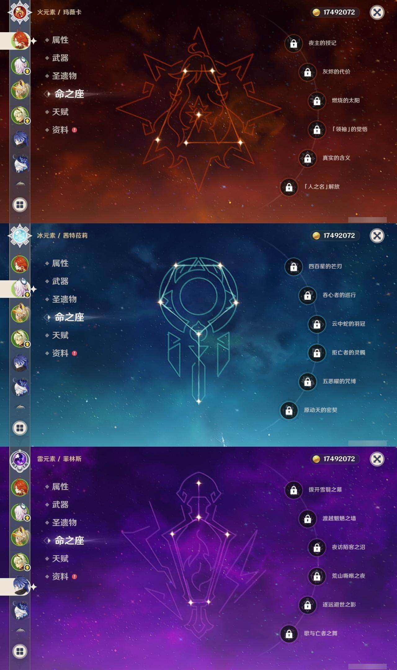 0命阿蕾奇诺,2命芙宁娜,2命迪希雅,0命艾尔海森,0命流浪者,0命纳西妲,1命提纳里,0命夜兰,1命申鹤,2命雷电将军,0命枫原万叶,0命神里绫华,0命钟离,0命胡桃,0命甘雨,满命魈,0命可莉,0命达达利亚,0命阿贝多,满命刻晴,5命七七,1命琴,3命莫娜,0命迪卢克,0命玛薇卡,0命茜特菈莉,0命梦见月瑞希,0命菲林斯,精1静水流涌之辉