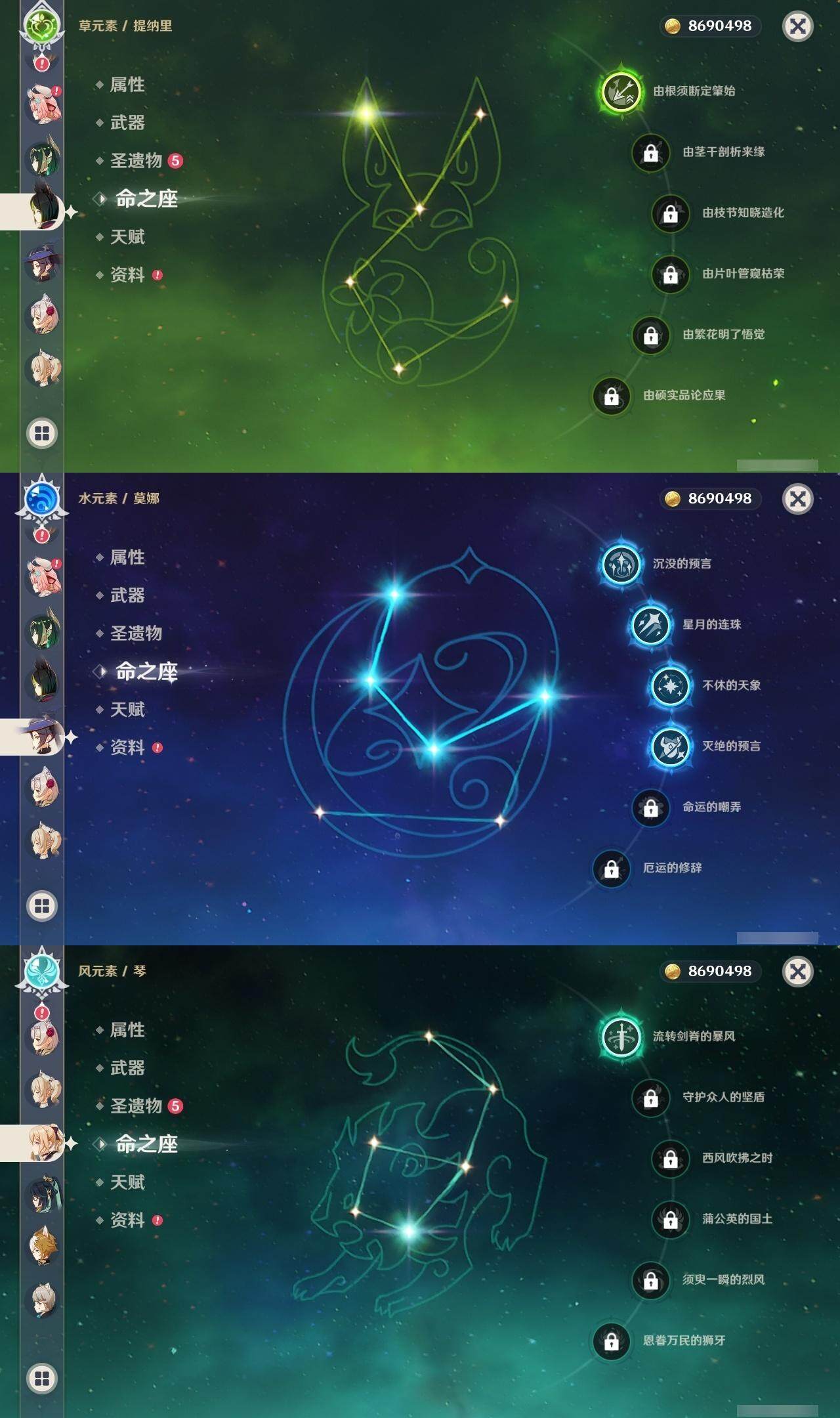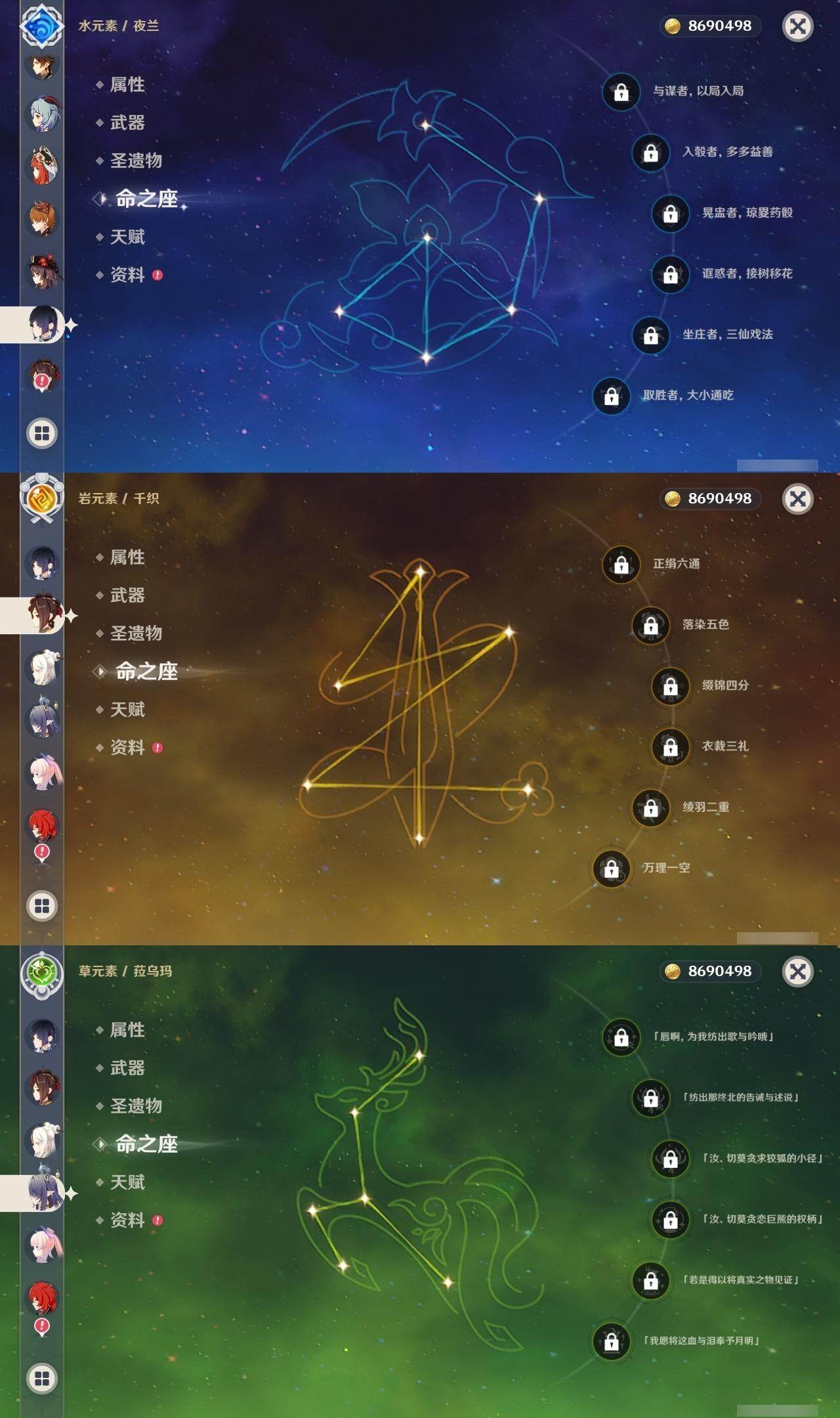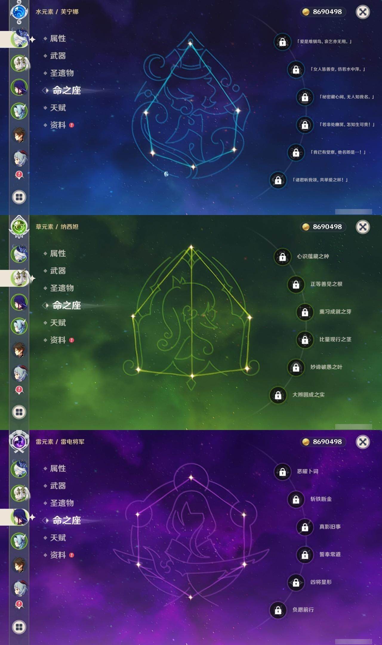 0命千织,0命闲云,0命芙宁娜,0命纳西妲,1命妮露,1命提纳里,0命夜兰,0命优菈,0命雷电将军,0命枫原万叶,0命钟离,0命胡桃,0命甘雨,0命温迪,0命达达利亚,0命珊瑚宫心海,2命刻晴,2命七七,1命琴,4命莫娜,0命迪卢克,0命梦见月瑞希,0命瓦雷莎,0命丝柯克,0命菈乌玛,0命奈芙尔,精1白雨心弦,精1图莱杜拉的回忆,精1圣显之钥