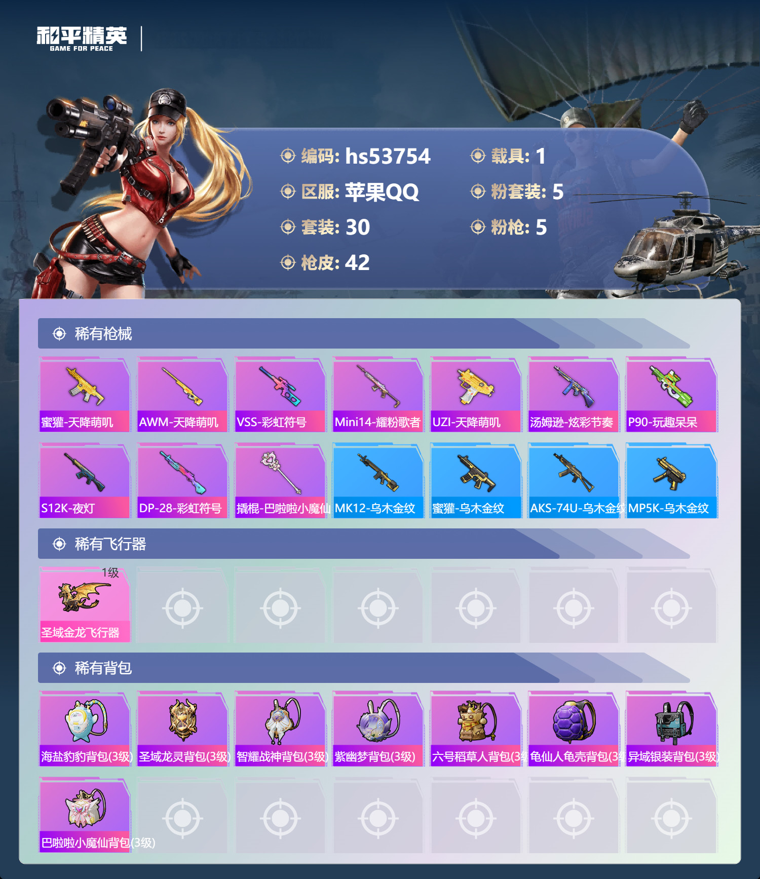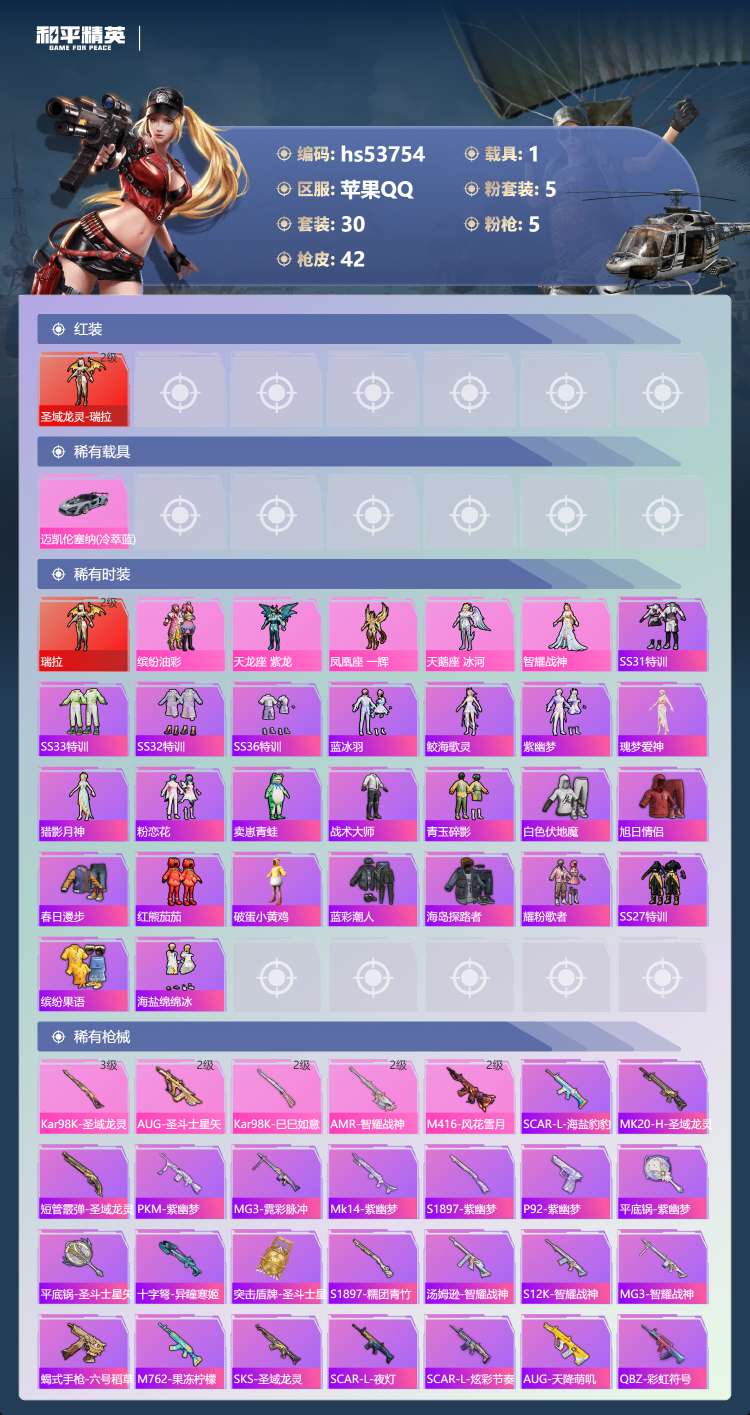 hs53754 苹果手Q-2王牌印记-1红装-5粉装-5特效枪-1载具-17243热力值-30套装-