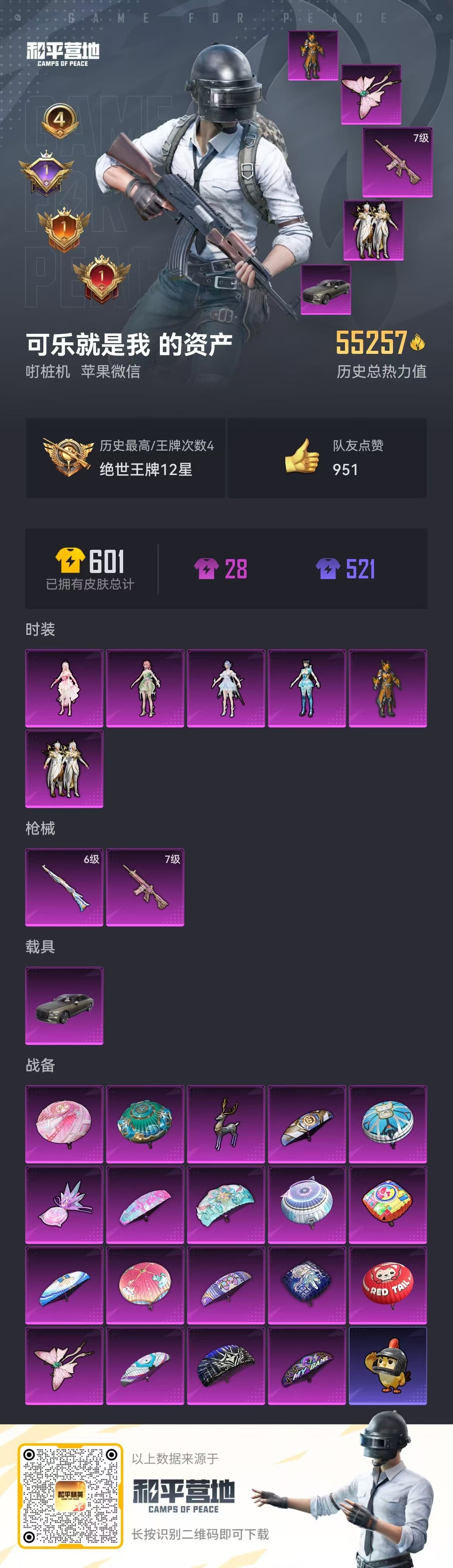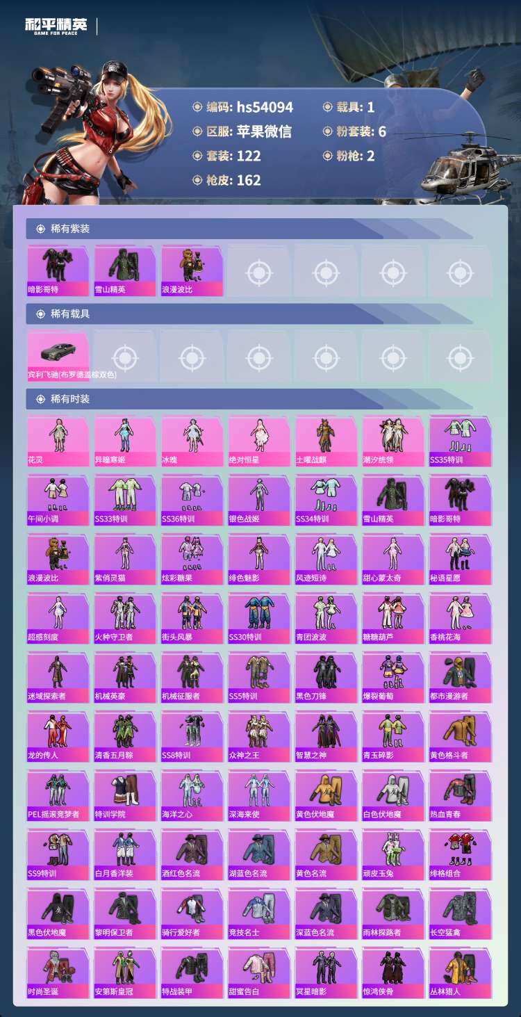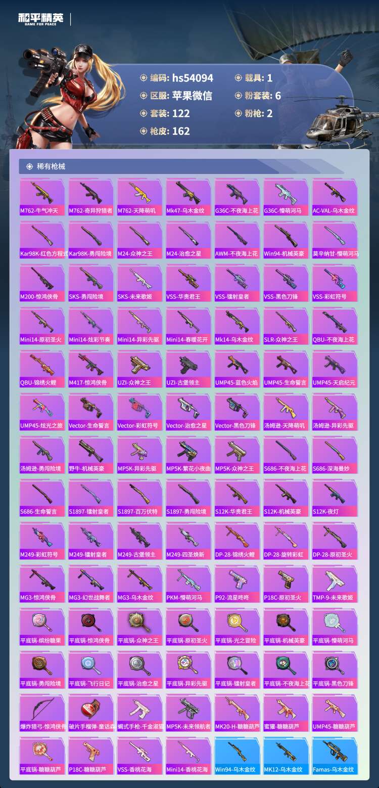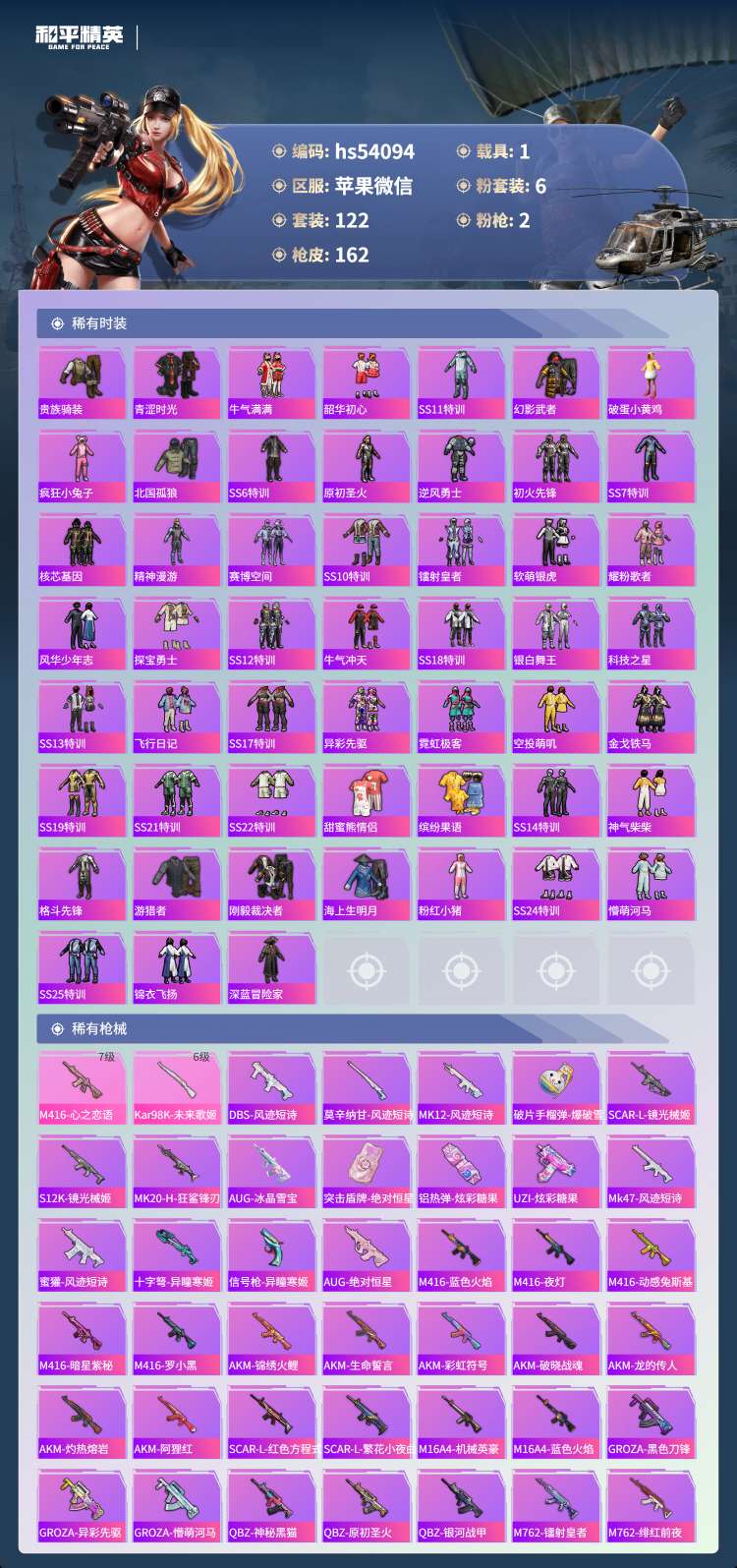 hs54094 苹果微-4王牌印记-6粉装-2特效枪-1载具-55257热力值-122套装-162