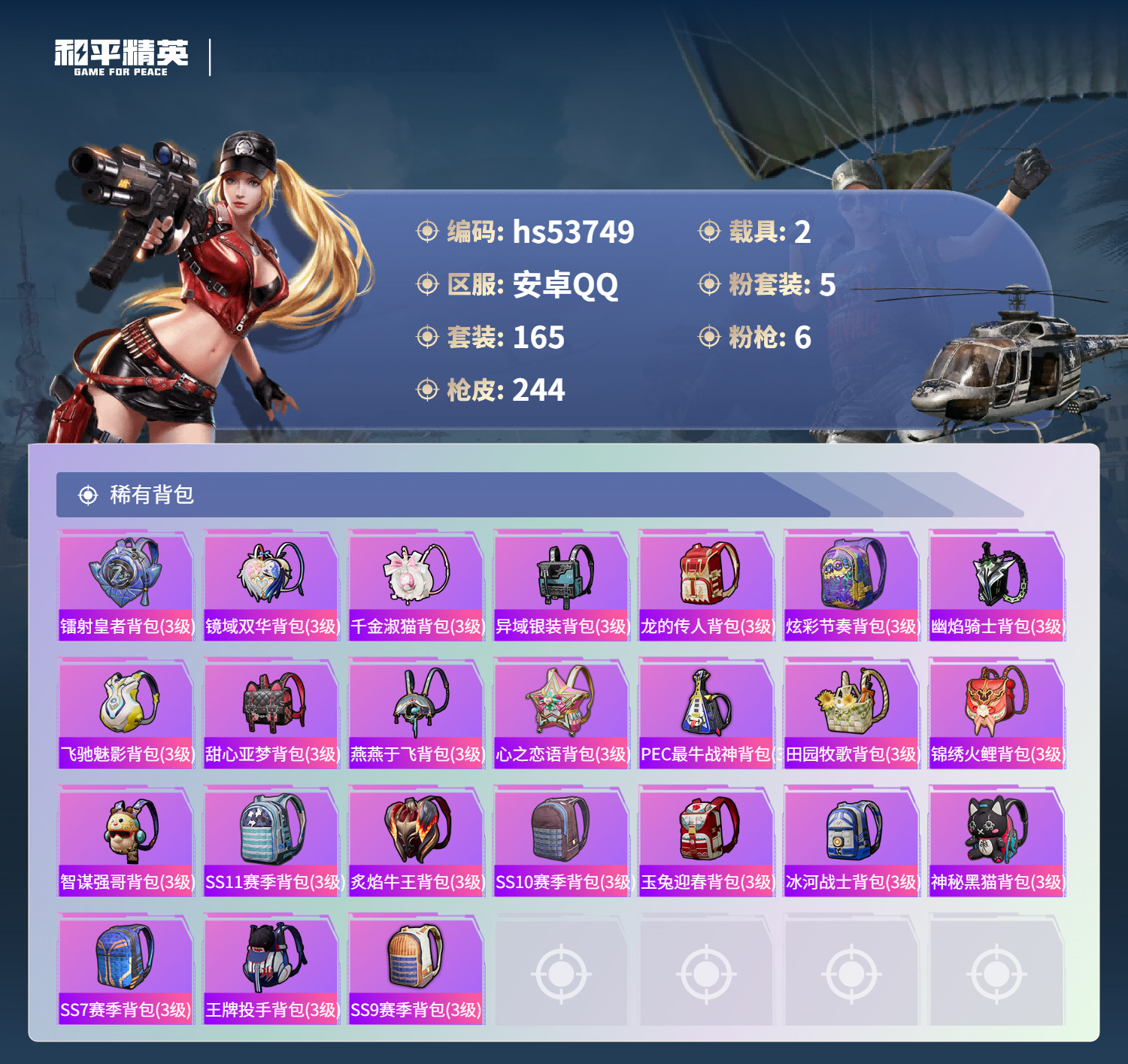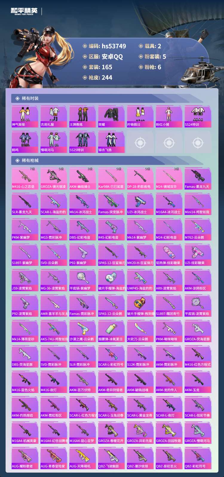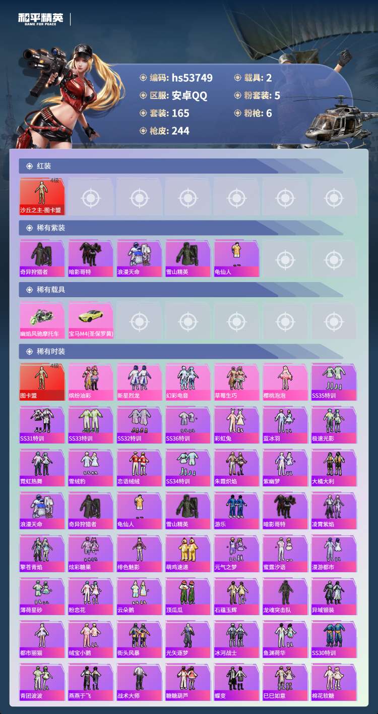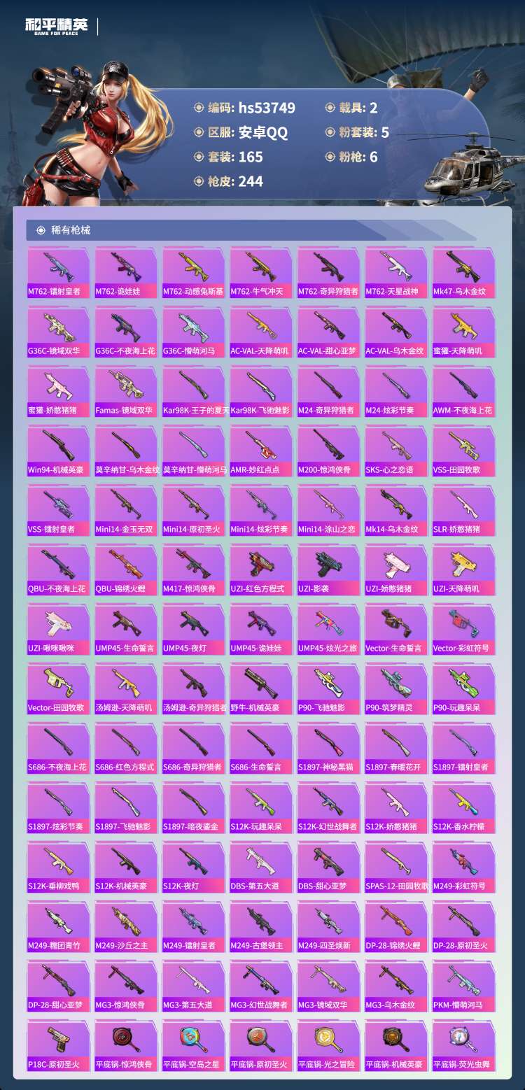 hs53749 安卓手Q-15王牌印记-1红装-5粉装-6特效枪-2载具-79287热力值-165套