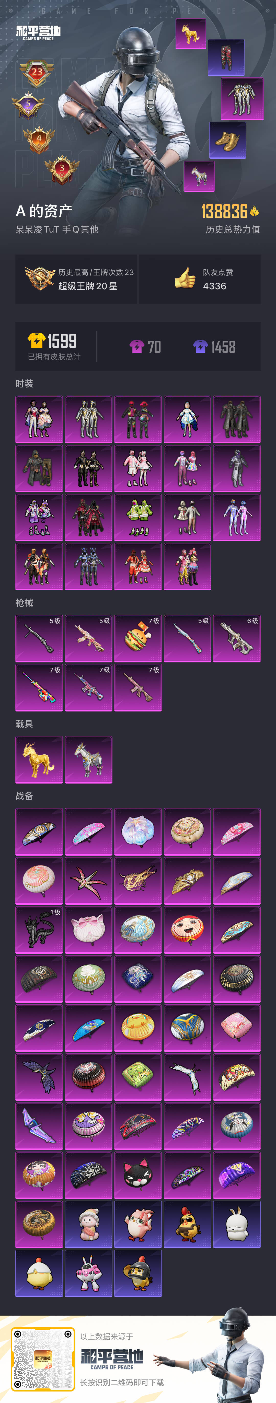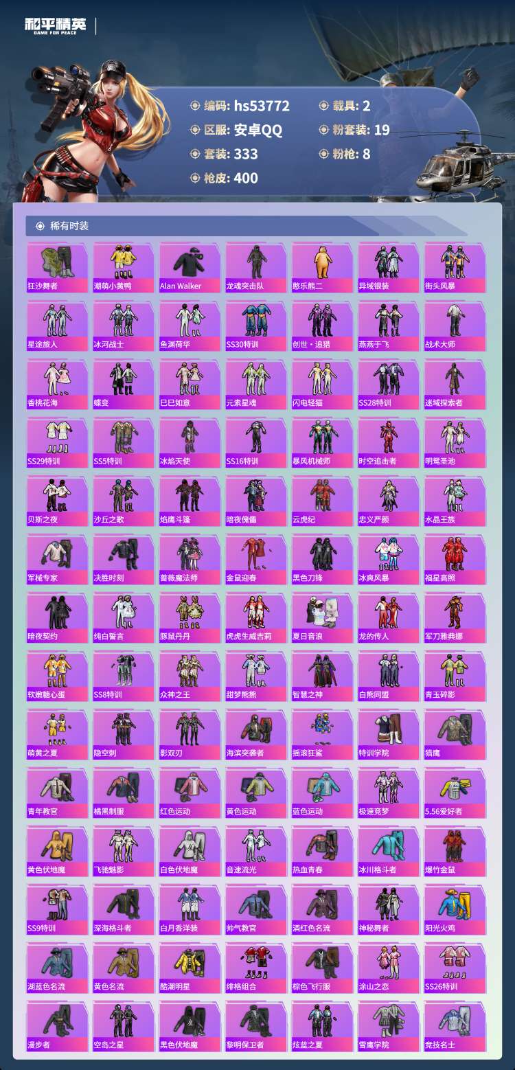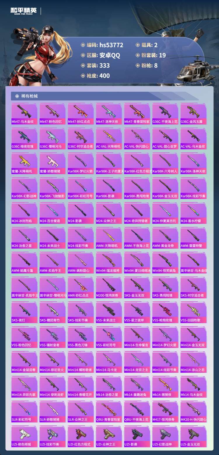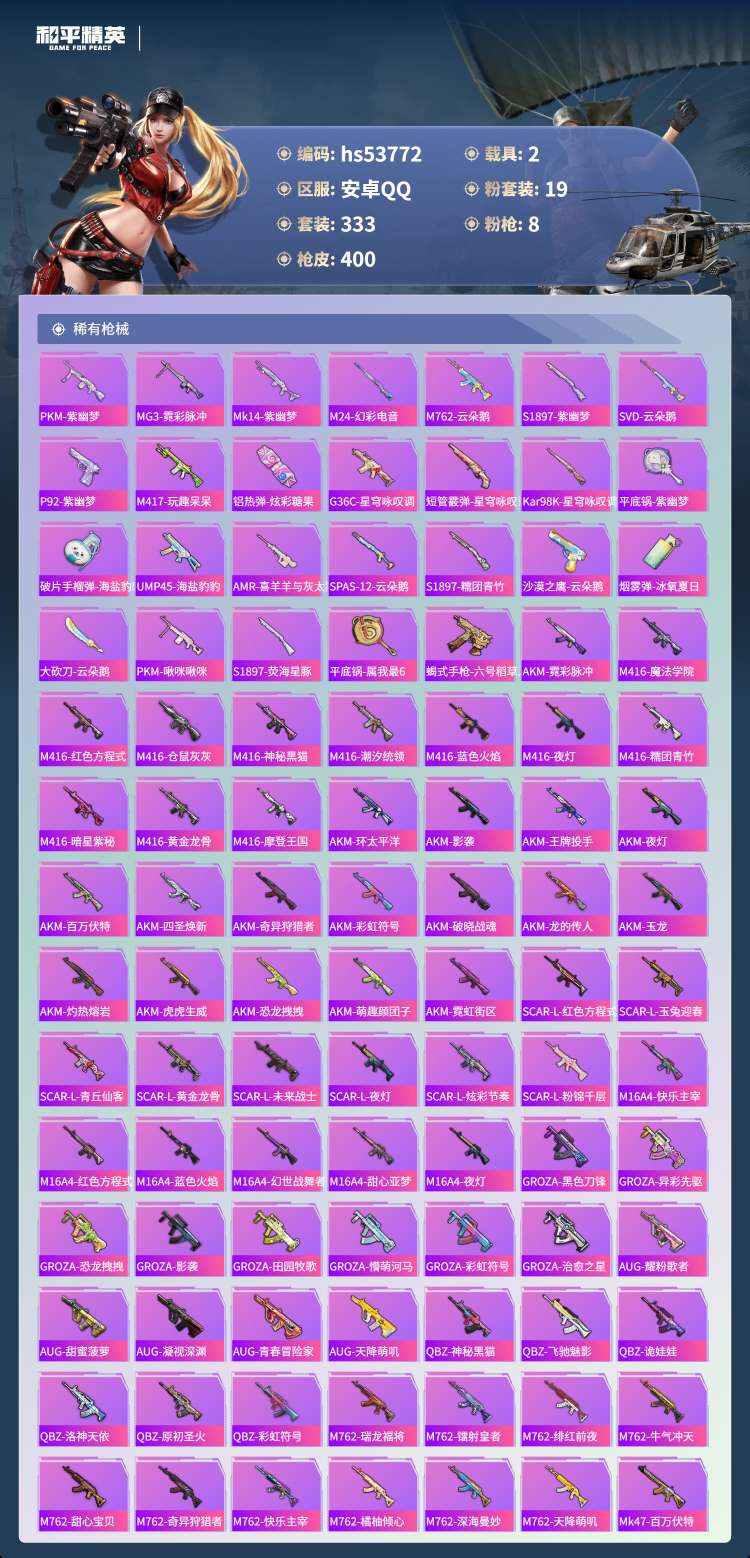 hs53772 安卓手Q-23王牌印记-19粉装-8特效枪-2载具-138836热力值-333套装-