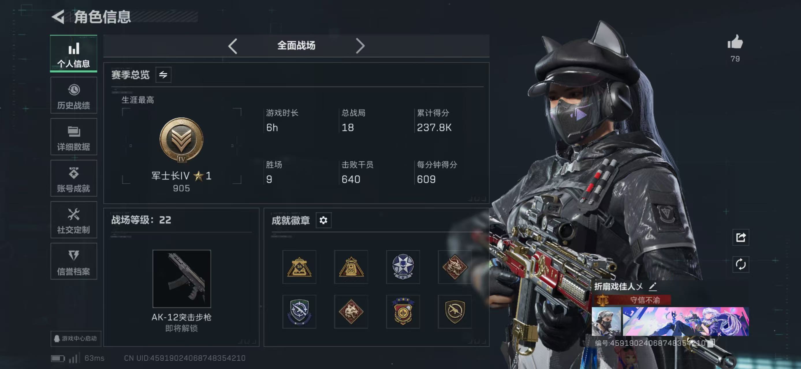 hssjz614 总资产186.9M,哈夫币 13288.48K,战场等级:22 列兵,行动等级:6