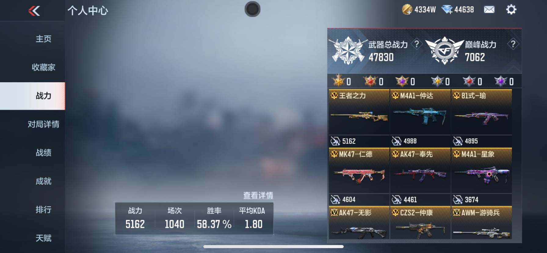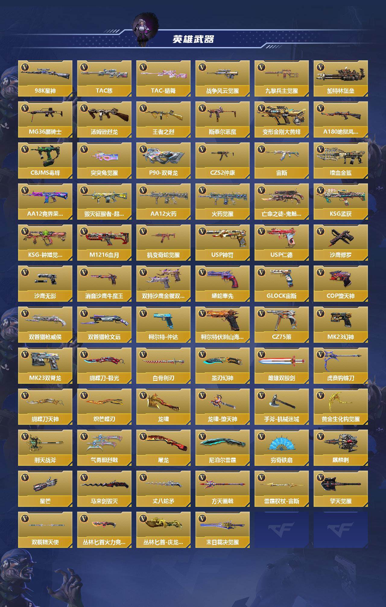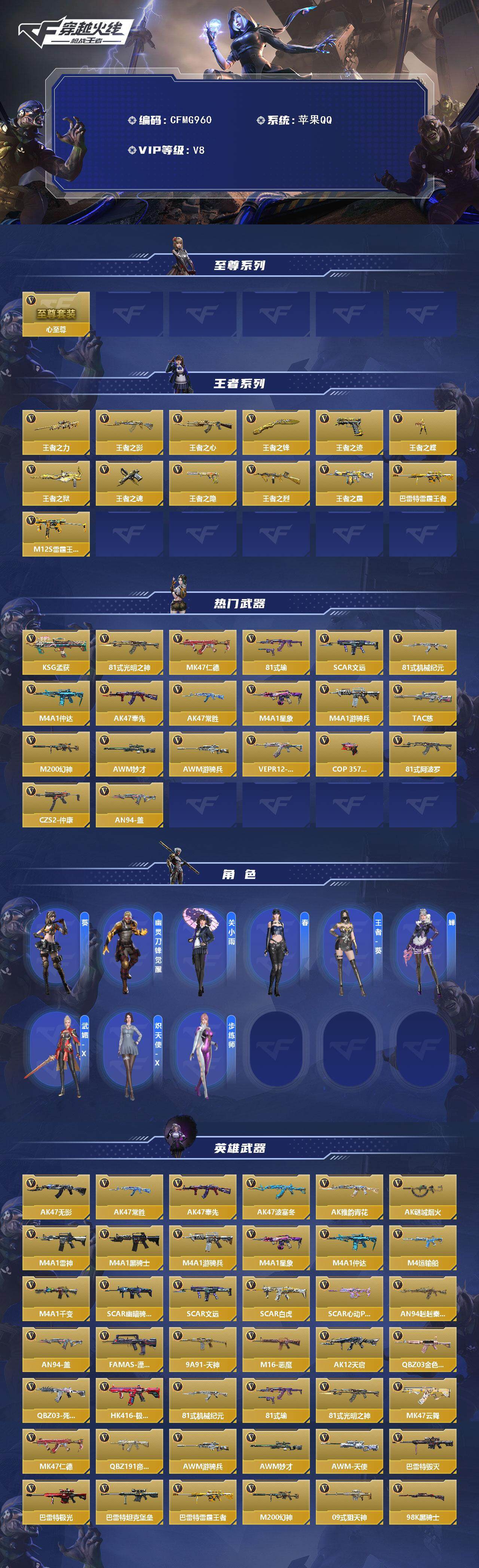 【CFMG960】VIP8/250V/心至尊/仁德套/奉先套/仲达套/王者之力/王者之影/王者之心/王者之锋/王者之迹/王者之蝶/王者之狱/王者之魂/王者之隐/王者之烈/王者之霆/巴雷特-雷霆王者/M12S-雷霆王者/KSG-孟获/81式-光明之神/MK47-仁德/81式-瑜/SCAR-文远/81式-机械纪元/M4A1-仲达/AK47-奉先/AK47-常胜/M4A1-星象/M4A1-游骑兵/TAC-慈/M200-幻神/AWM-妙才/AWM-游骑兵/VEPR12-宙斯/COP 357-堕天神/81