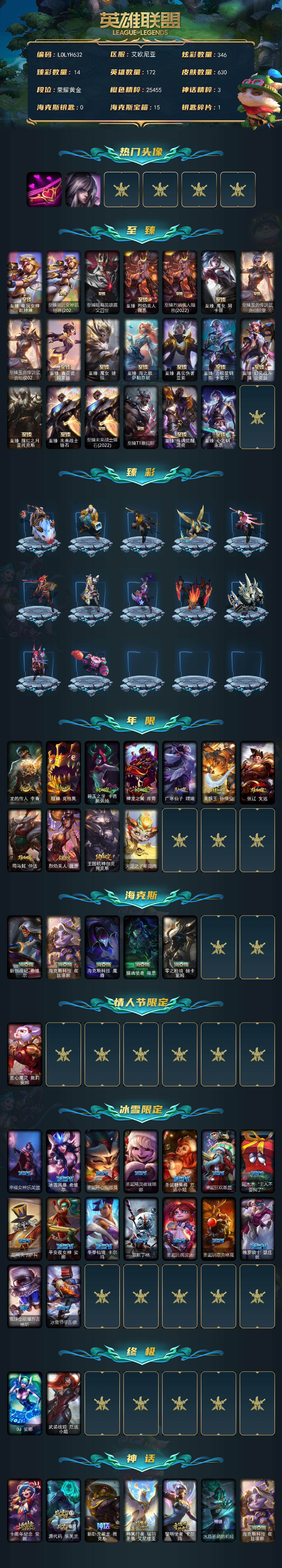 【LOLYH632】172英雄/630皮肤/2终极/31神话/95限定/14臻彩/346炫彩/56传说/152史诗/黄金/爱情之歌头像/玉剑传说无影头像/至臻电玩女神凯特琳/至臻电玩女神凯特琳(2022)/至臻暗裔英雄嘉文四世/至臻烈焰美人薇恩/至臻烈焰美人薇恩(2022)/至臻魔女阿卡丽/至臻玉剑传说武剑仙锐雯/至臻玉剑传说武剑仙(2022)/至臻青花瓷拉克丝/至臻魔女婕拉/至臻海之歌萨勒芬妮/至臻真实伤害亚索/至臻北极星钢影卡蜜尔/至臻幻灵战斗猫金克丝/至臻腥红之月亚托克斯/至臻未来战士锤石