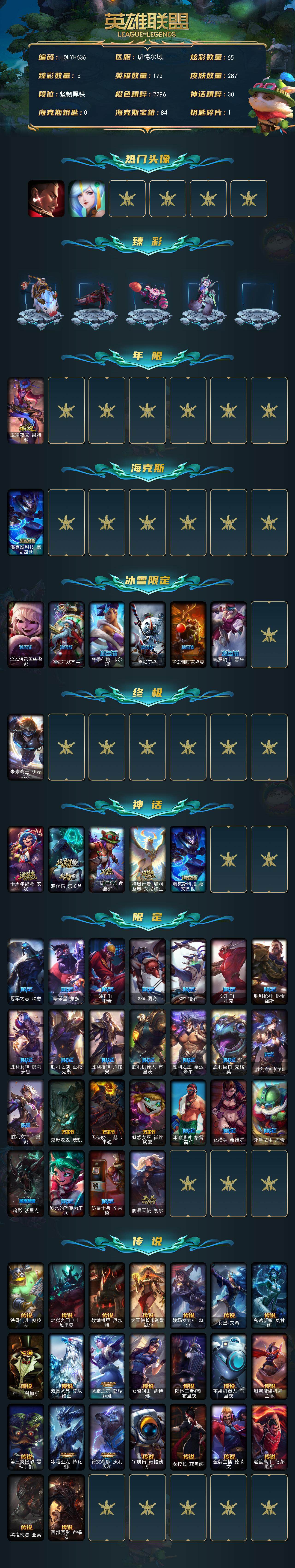 【LOLYH636】172英雄/287皮肤/1终极/5神话/32限定/5臻彩/65炫彩/23传说/73史诗/未定级账号等级:561/觅心游侠卢锡安头像/春晖神女头像/无畏骑士瑟庄妮赤子初心/西部天使赛娜贝利尔之怠/可爱可爱粉红红布里茨/魔女阿卡丽虚荣/净雪之月莫甘娜冬虹/玉净夜叉凯特琳/海克斯科技嘉文四世/圣诞精灵崔丝塔娜/圣诞狂欢基兰/冬季仙境卡尔玛/雪默丁格/圣诞驯鹿克格莫/魄罗骑士瑟庄妮/未来战士伊泽瑞尔/十周年纪念安妮/源代码乐芙兰/十五周年纪念希维尔/神凰行者瑞羽圣凰艾尼维亚/冠军之志