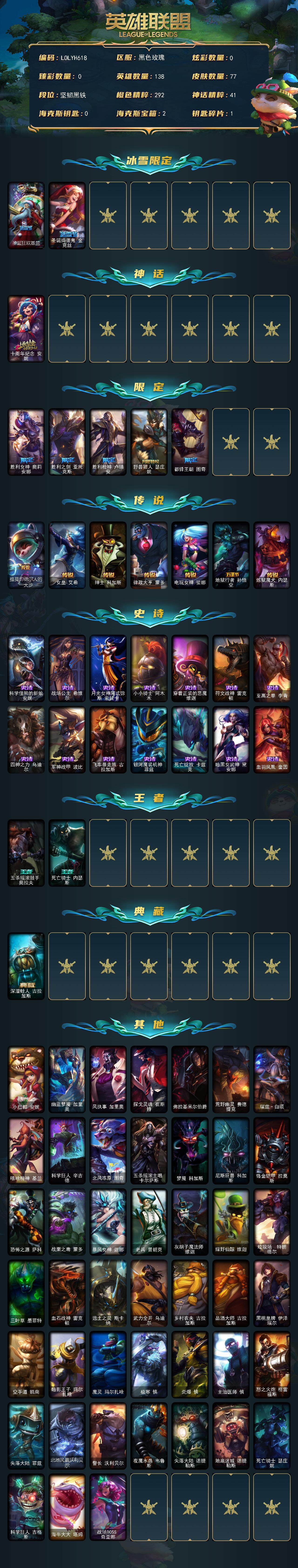【LOLYH618】138英雄/77皮肤/1神话/7限定/7传说/14史诗/未定级/圣诞狂欢基兰/圣诞捣蛋鬼金克丝/十周年纪念安妮/胜利女神奥莉安娜/胜利之剑亚托克斯/胜利枪神卢锡安/野兽猎人瑟庄妮/都铎王朝图奇/提莫约德尔人的一大步/女皇艾希/绅士科加斯/律政大亨蒙多/电玩女神娑娜/地狱行者孙悟空/炼狱魔犬内瑟斯/科学怪熊的新娘安妮/战场公主希维尔/月光女神阿忒弥斯索拉卡/小小骑士阿木木/穿着正装的恶魔维迦/符文战神雷克顿/至高之拳李青/四神之力乌迪尔/军神战甲波比/飞车暴走族古拉加斯/银河魔