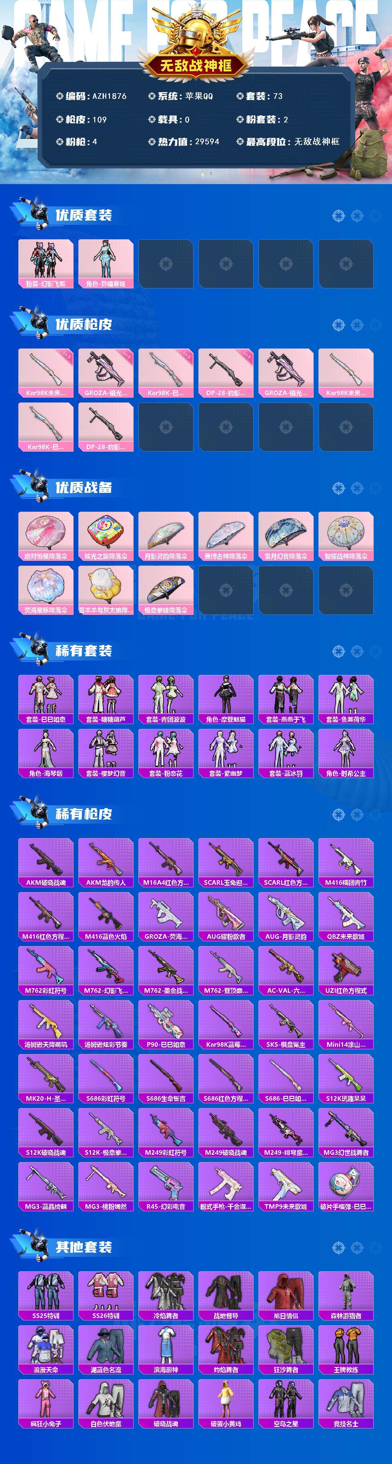 【AZH1876】苹果 手Q【7印记 无敌战神框】无敌战神框-2粉装-4特效枪-0载具-1粉色飞行器-29594热力值-7王牌印记-73套装-109枪皮