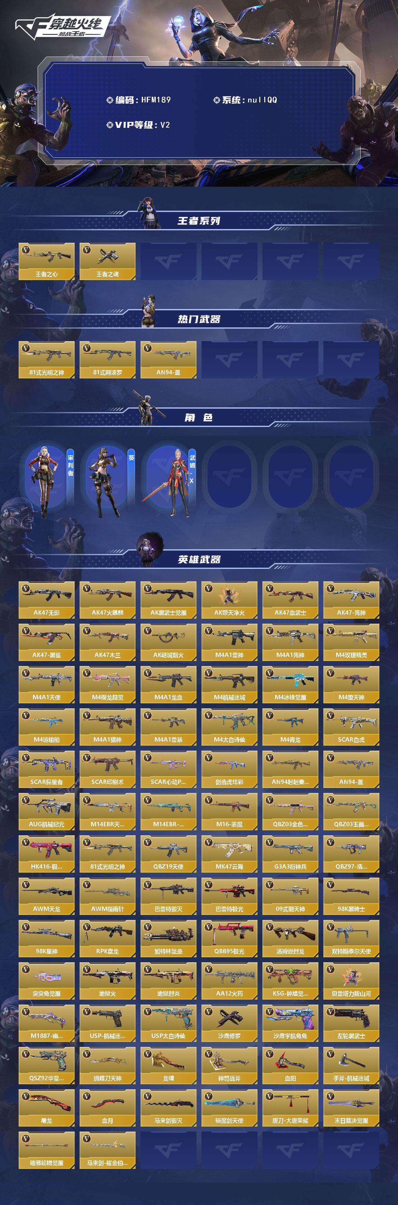 【英雄武器】:AK47-无影,AK47-火麒麟,AK47-黑武士觉醒,AK47-燎天净火,AK47-血武士,AK47-死神,AK47-黑鲨,AK47-木兰,AK47-谜城烟火,M4A1-雷神,M4A1-死神*2,M4A1-玫瑰精灵,M4A1-天使,M4A1-樱龙·超觉,M4A1-龙