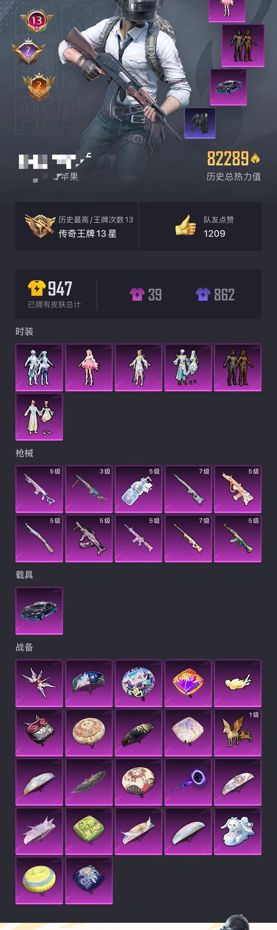 224-【金鞋螳螂都市6粉装10特效枪1载具可秒换绑】 苹果Q区-82289热力值-13印记-188套装-260枪皮 【1载具】 布加迪威龙(海洋蓝)【3稀有】 8号机 Mark.06 派对舞王【6粉装】 莲影清波 繁龙极客 金丰海韵 角色-樱桃泡泡 幻彩电音 角色-月影灵韵【10特效枪】 AWM-橘柚倾心(7级) AKM-绿萝繁花(5级) M416-电玩时刻(5级) Mk14-甜梦熊击(5级) MG3-辉羽雀灵(3级) 烟雾弹-甜梦果泡(5级) GROZA-镜光银凌(5级) Kar98K-巳巳