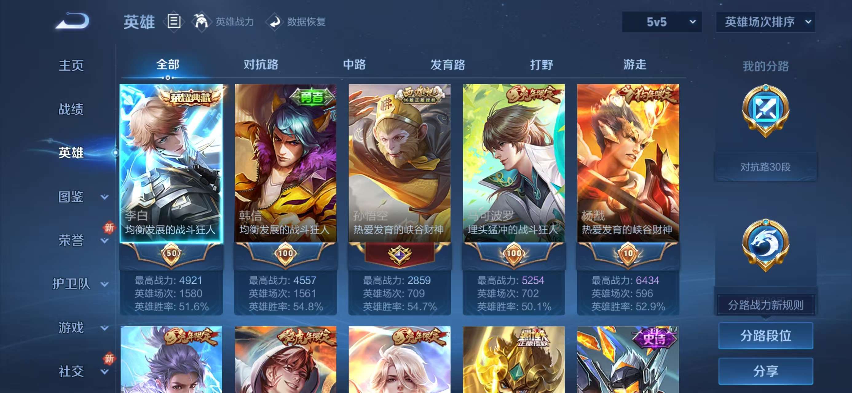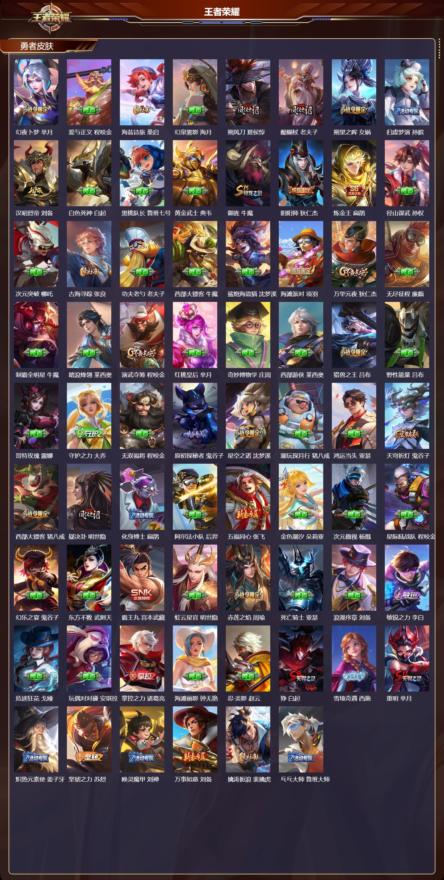 安卓QQ/荣耀王者/353皮肤/126英雄/1典藏/0珍品无双/0无双/0珍品传说/25传说/99史