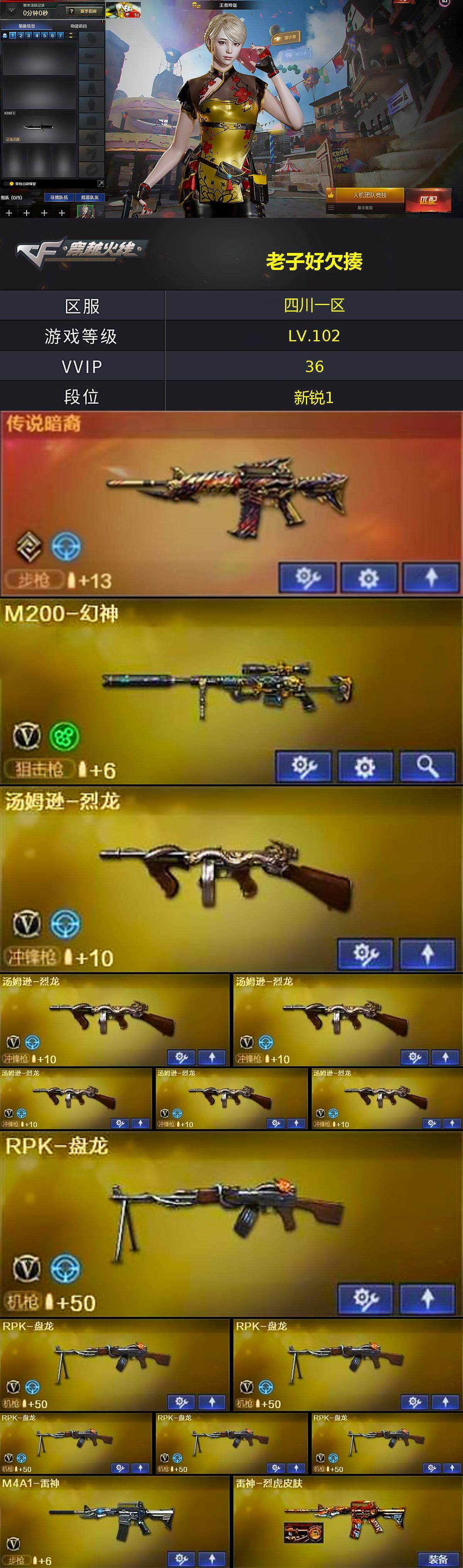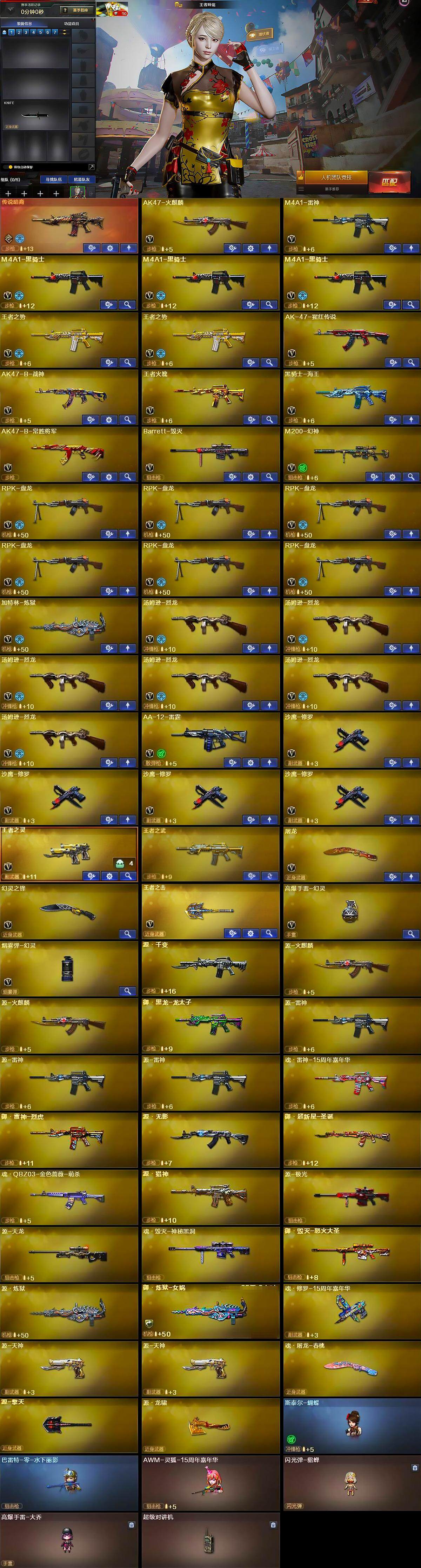 【热门武器】:传说暗裔,M200-幻神,M4A1-黑骑士*3,汤姆逊-烈龙*6,RPK-盘龙*6,加特林-炼狱,斯泰尔-蝴蝶,沙鹰-修罗*4