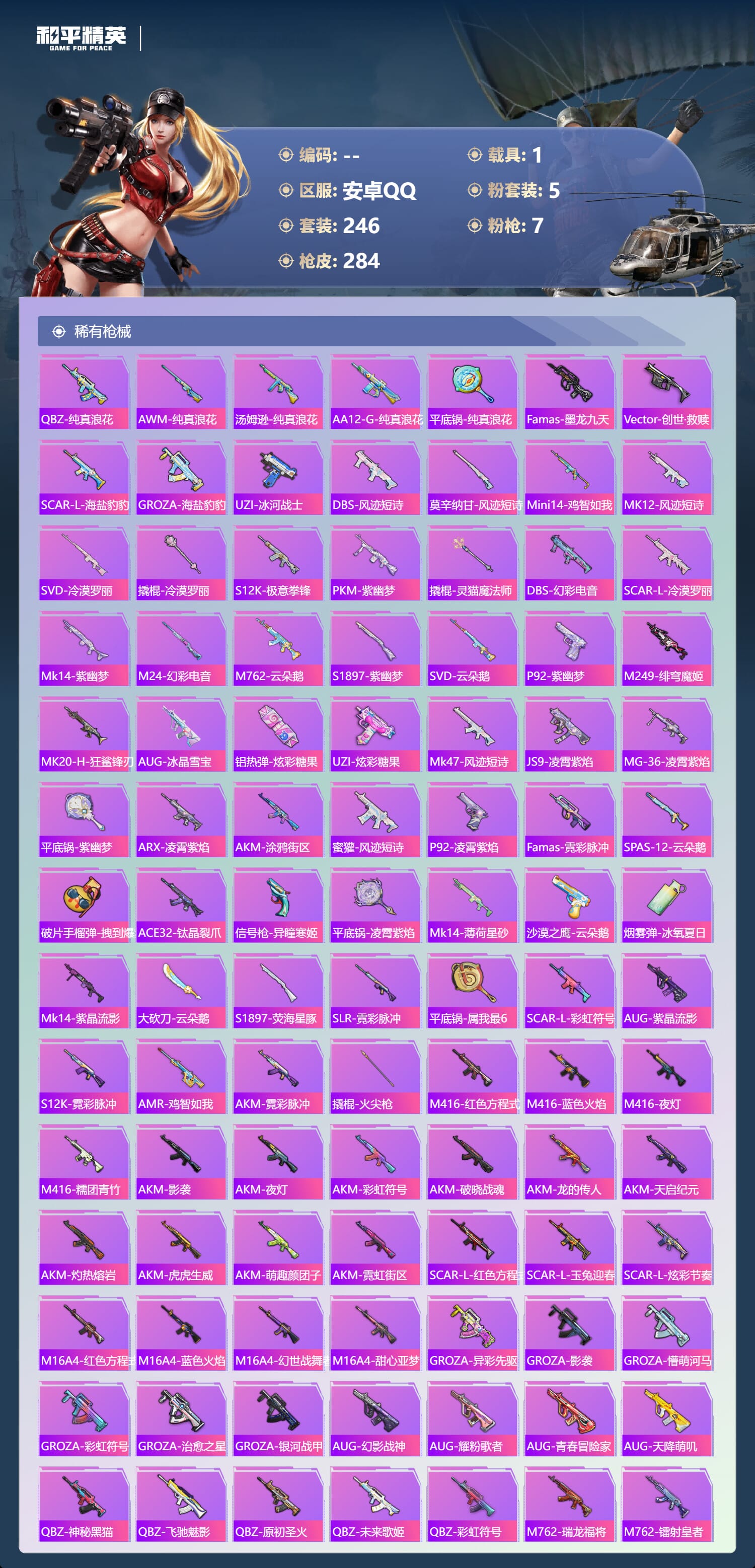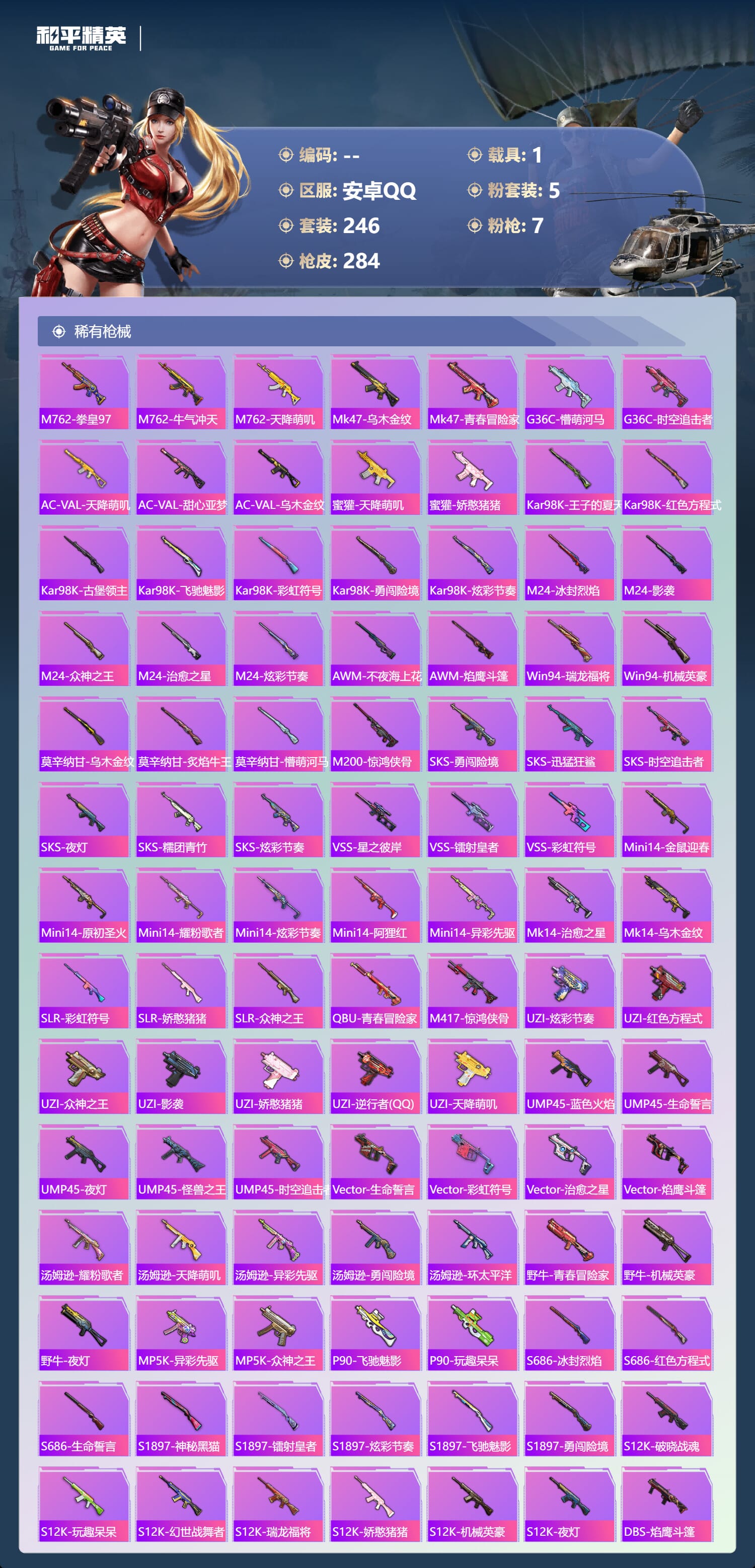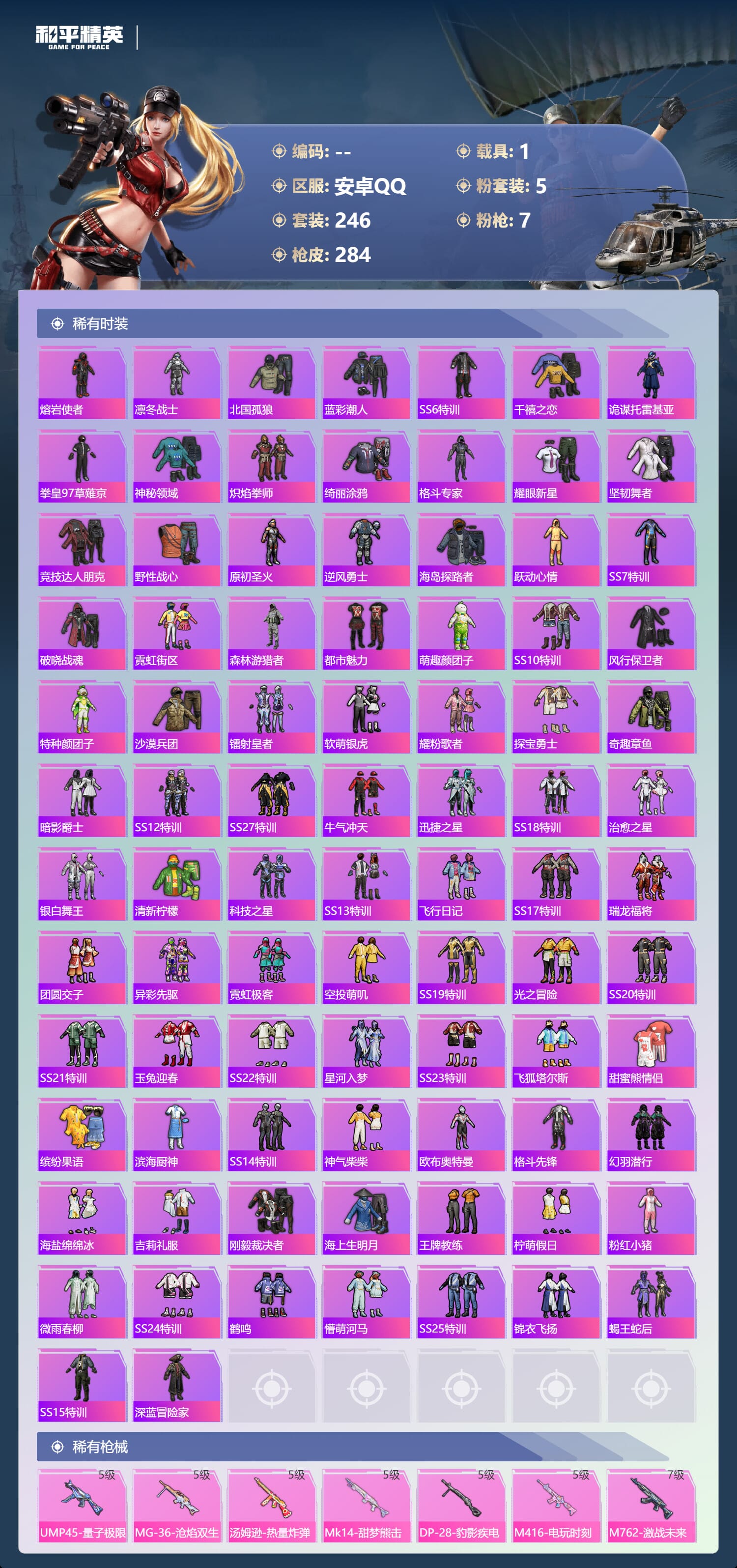 a4188/安卓QQ/-18王牌印记-5粉装-7特效枪-1载具-89177热力值-246套装-284