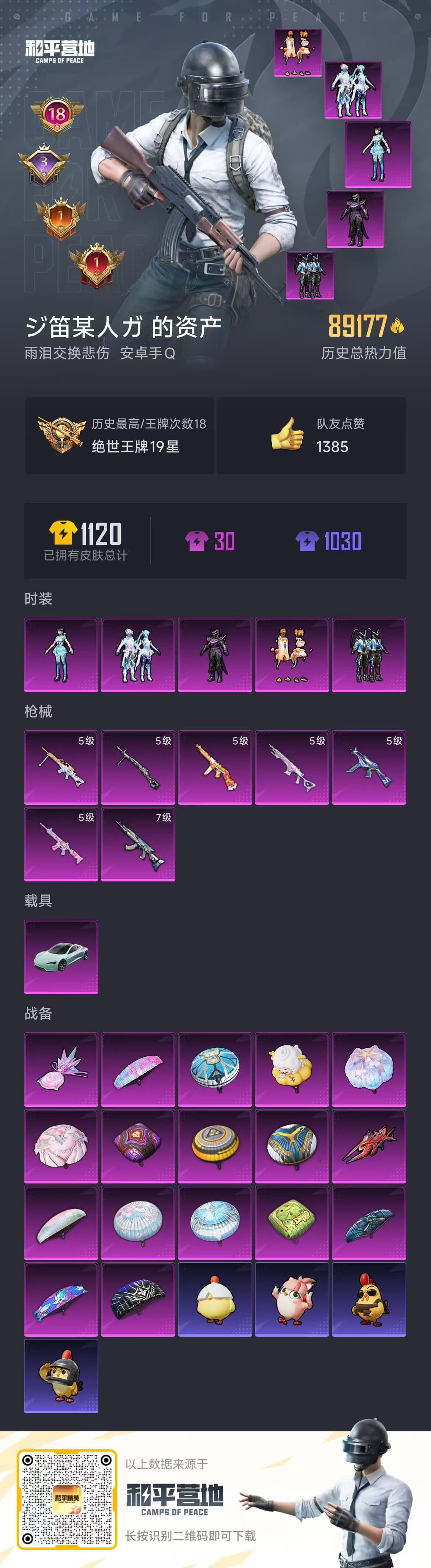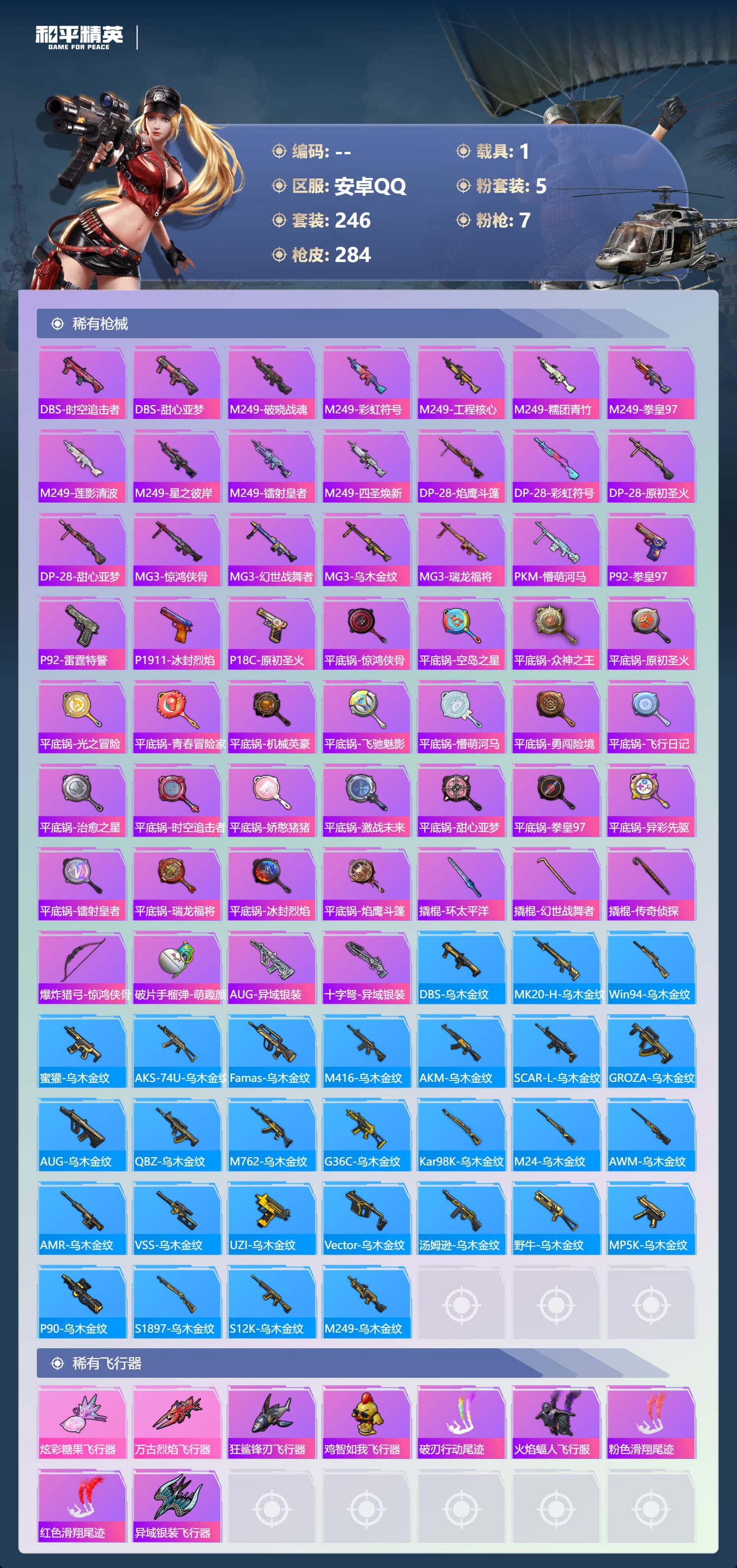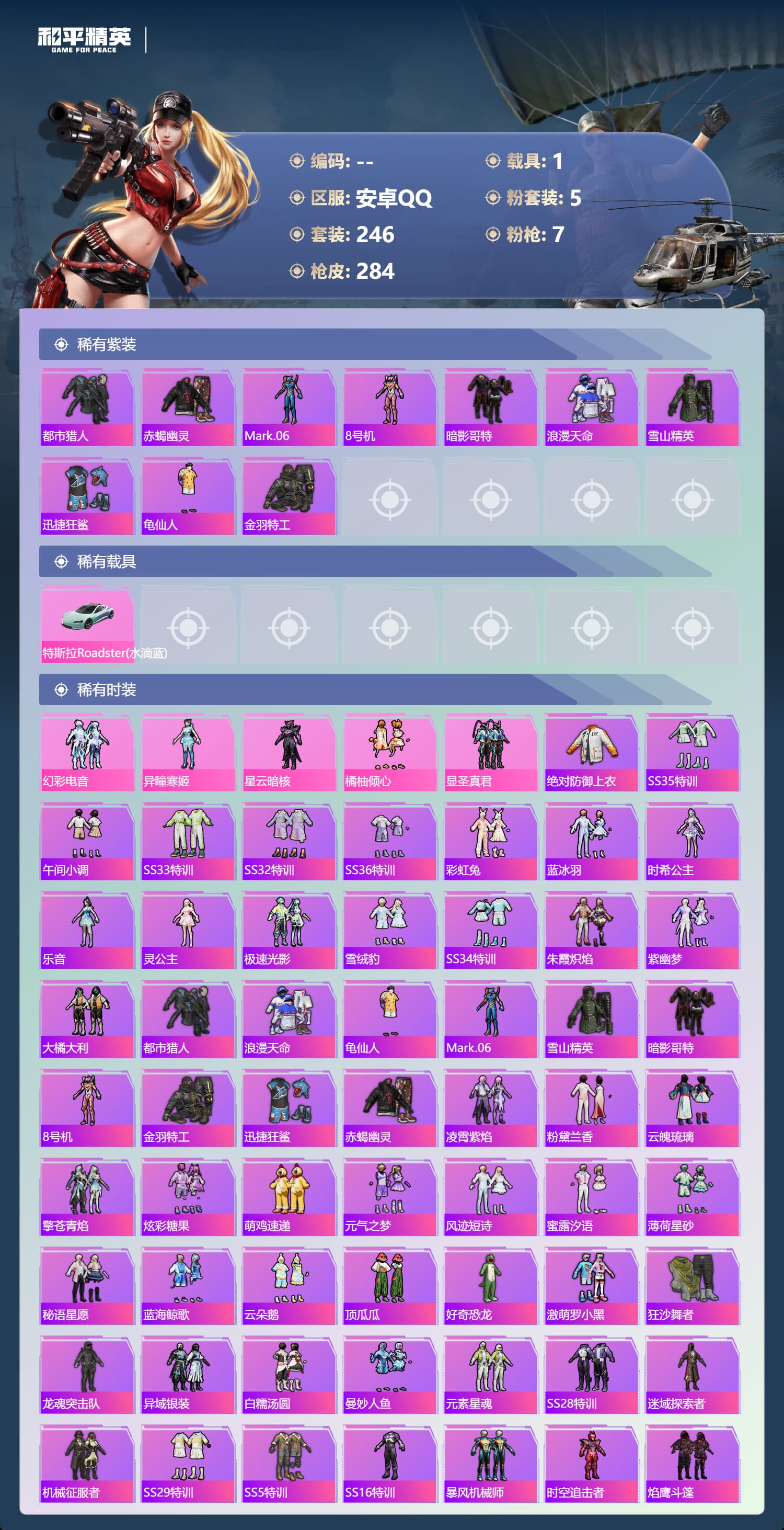 a4188/安卓QQ/-18王牌印记-5粉装-7特效枪-1载具-89177热力值-246套装-284