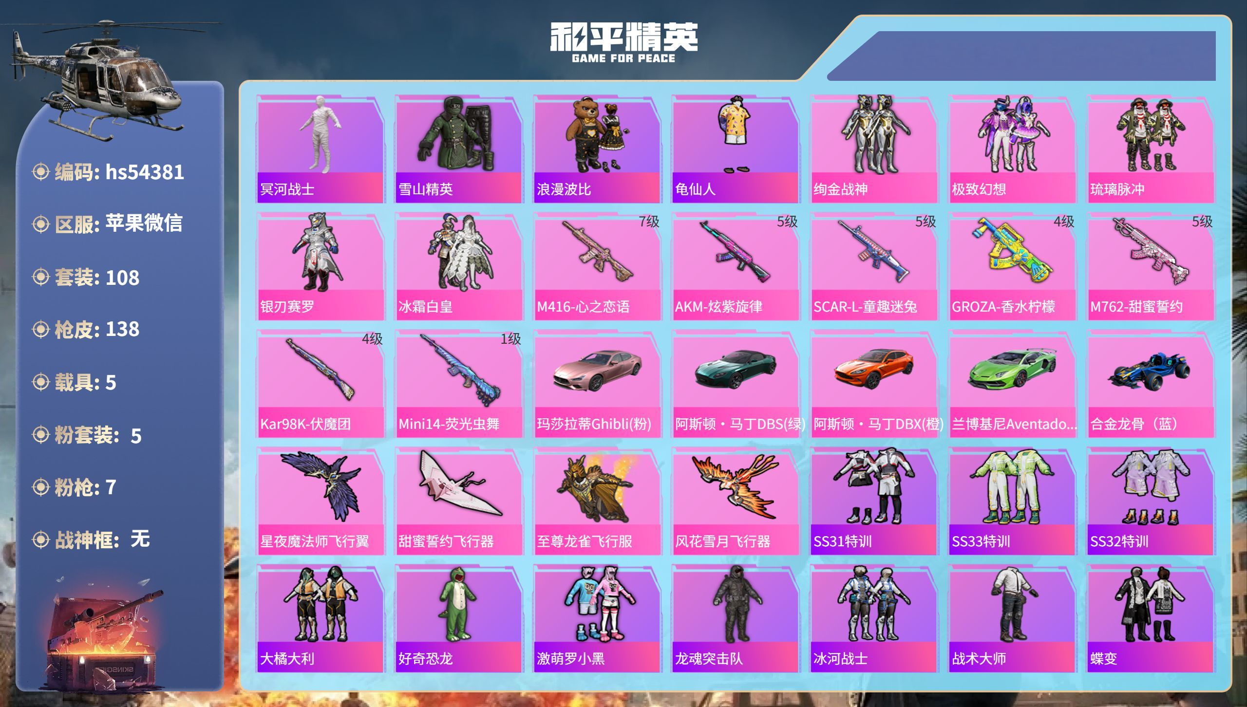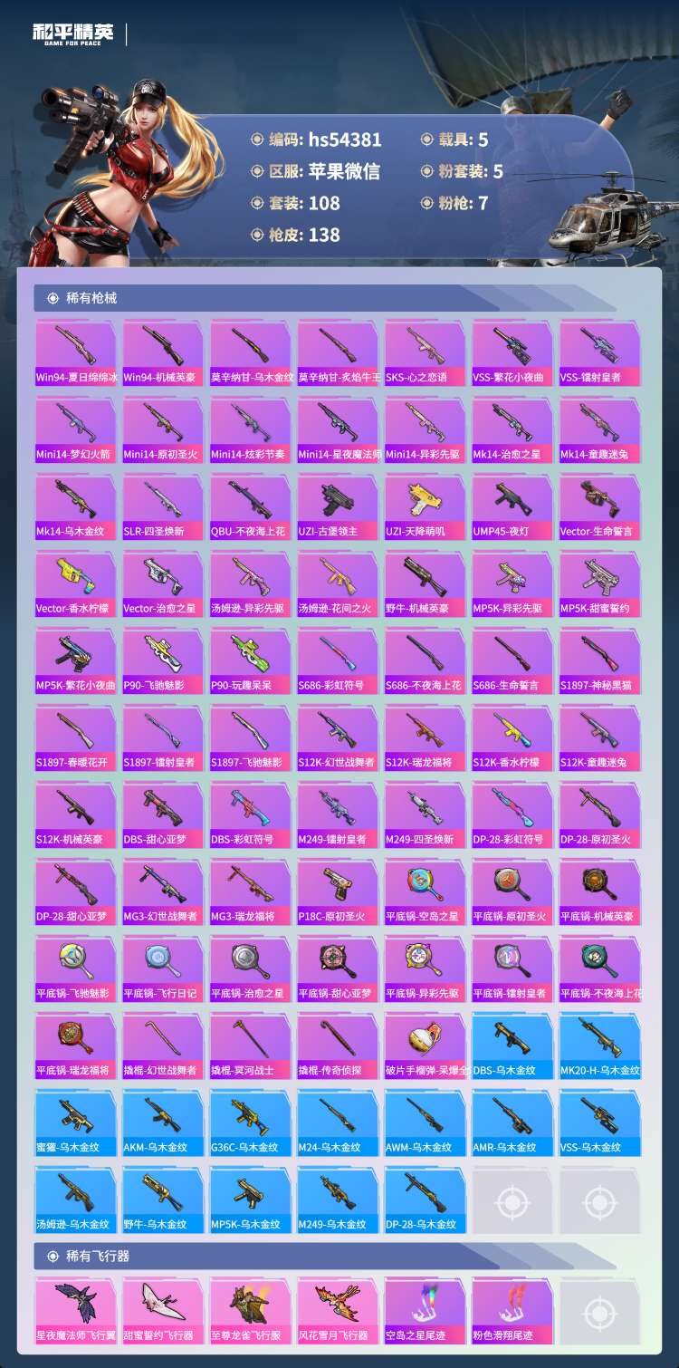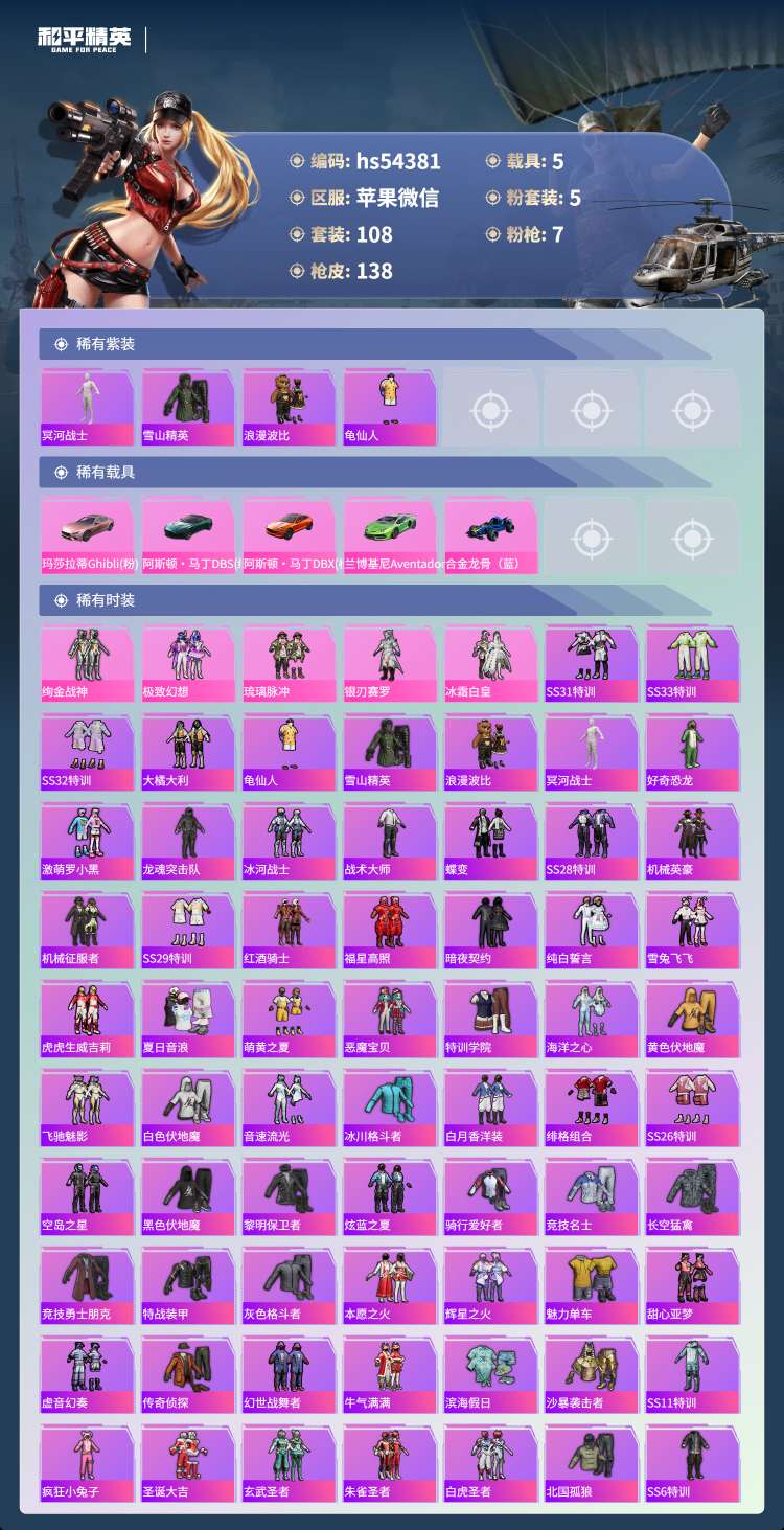 hs54381 苹果微-10王牌印记-5粉装-7特效枪-5载具-53592热力值-108套装-13