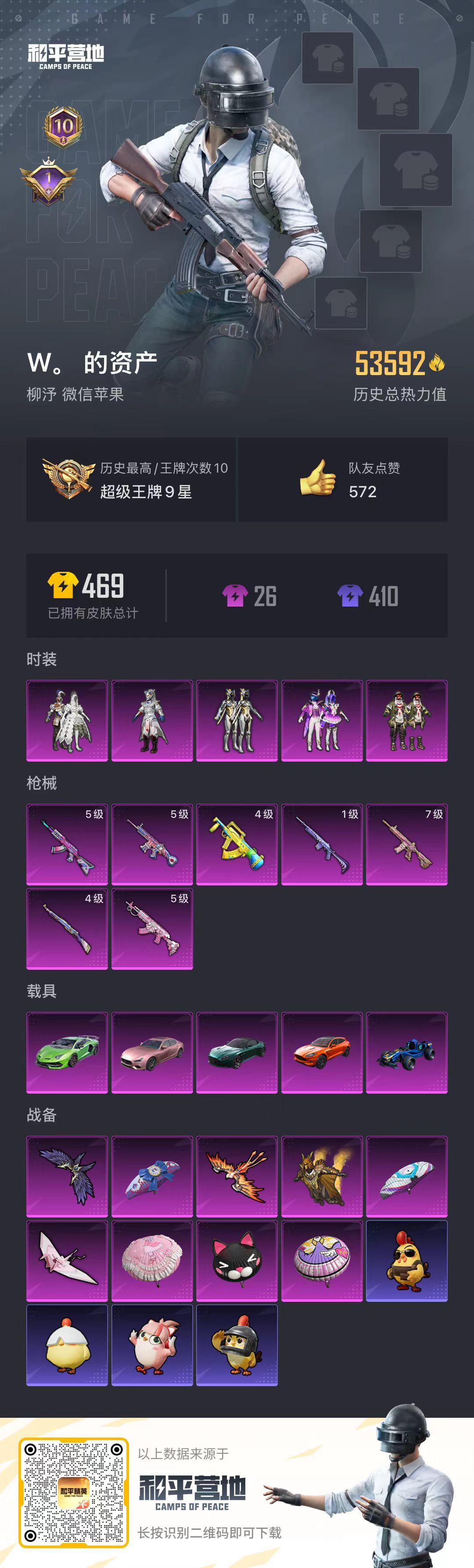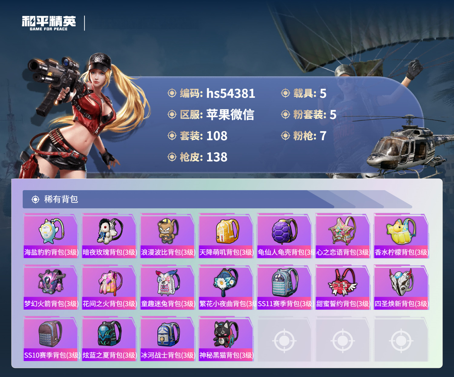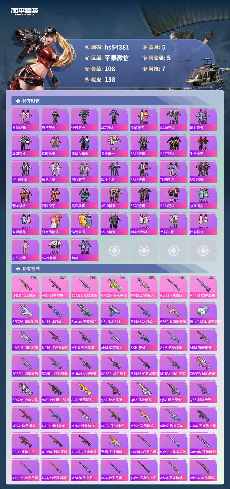 hs54381 苹果微-10王牌印记-5粉装-7特效枪-5载具-53592热力值-108套装-13