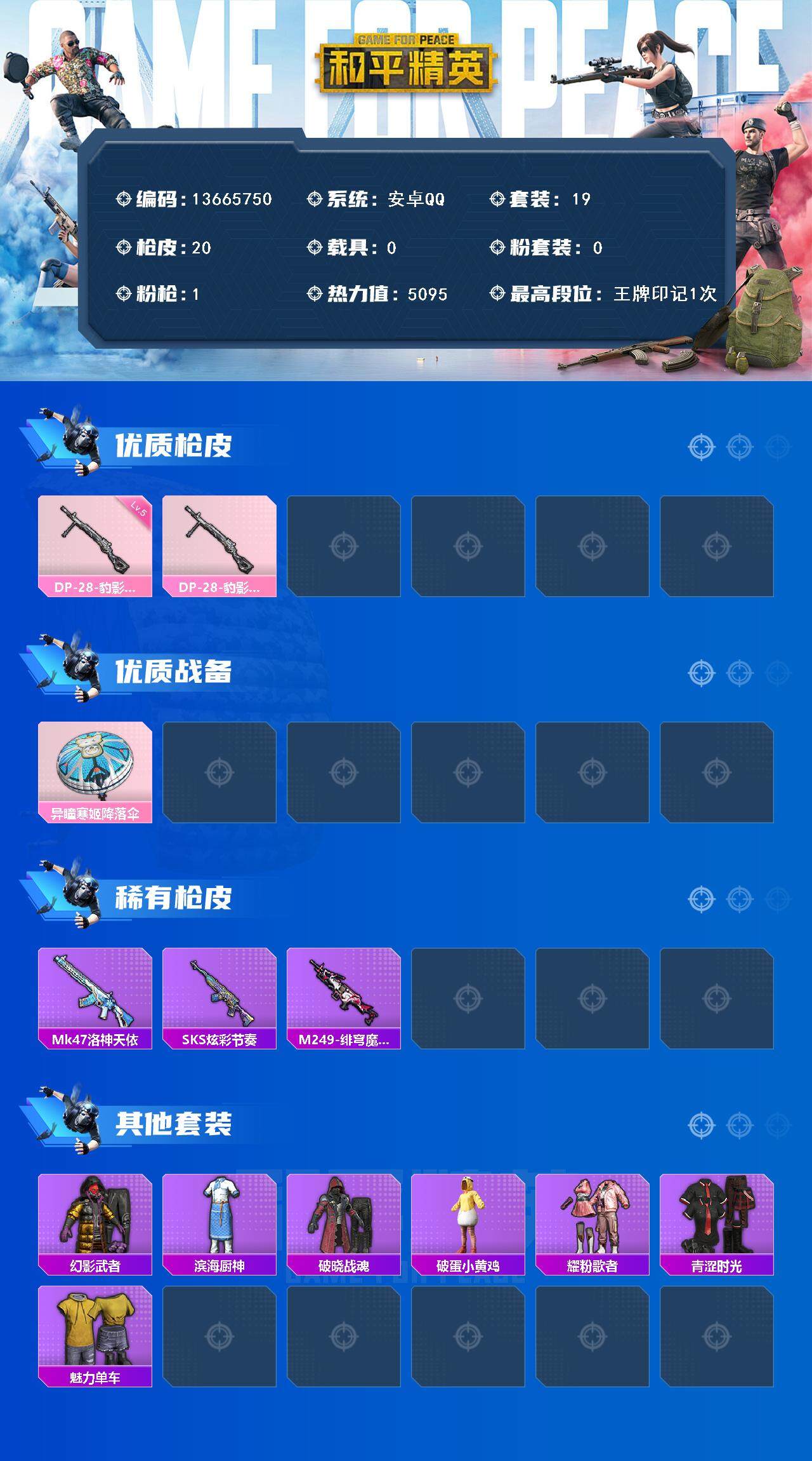 19套装/枪械1/装备20/战备18/王牌印记1/热力值5095/五级DP-28-豹影疾电/DP-28-豹影疾电/异瞳寒姬降落伞/MK47-洛神天依/SKS-炫彩节奏/M249-绯穹魔姬/幻影武者/套装-滨海厨神/破晓战魂/破蛋小黄鸡/耀粉歌者/青涩时光/魅力单车