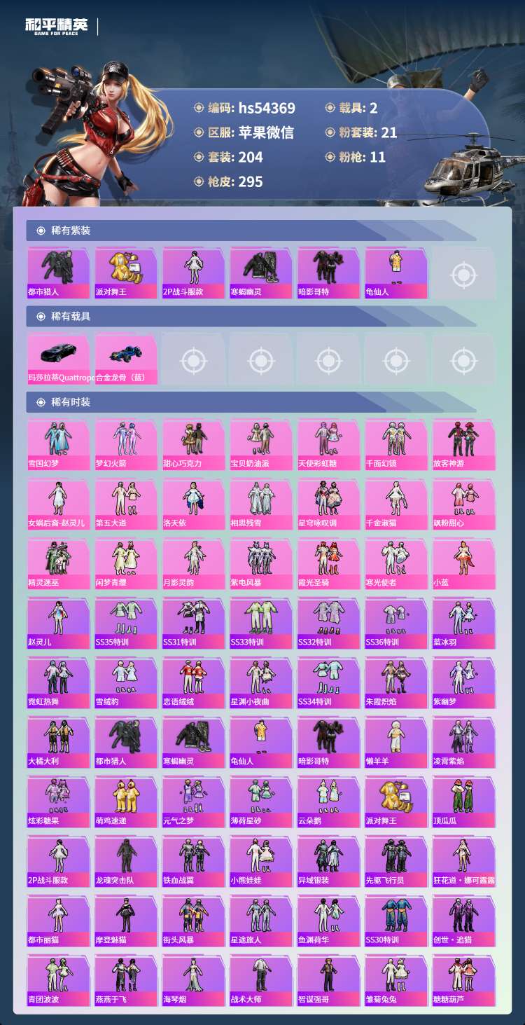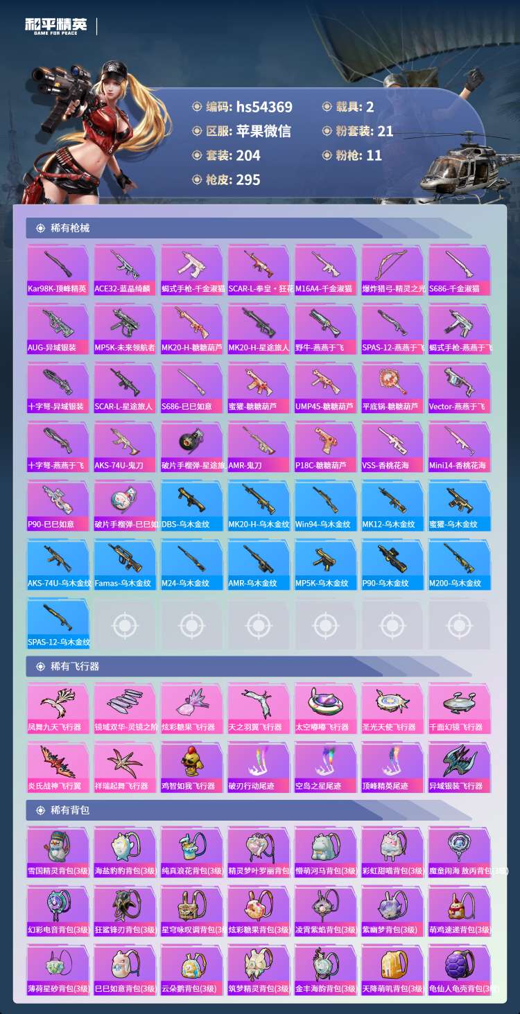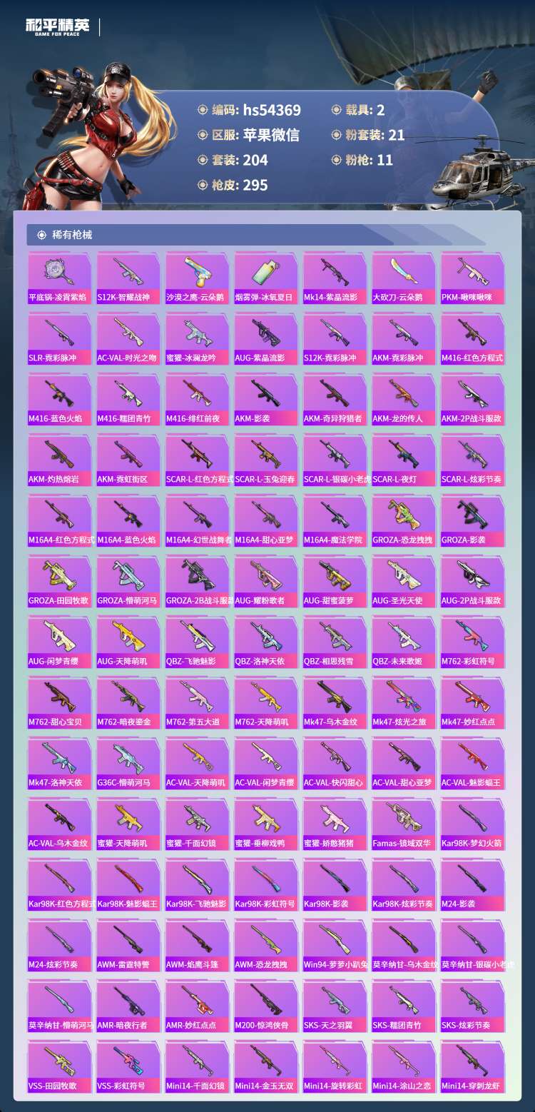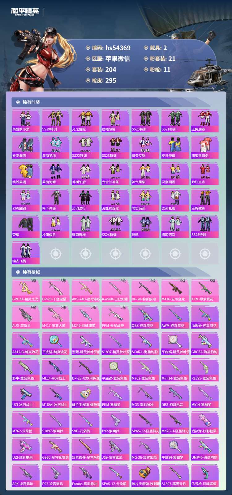 hs54369 苹果微-17王牌印记-21粉装-11特效枪-2载具-102377热力值-204套装