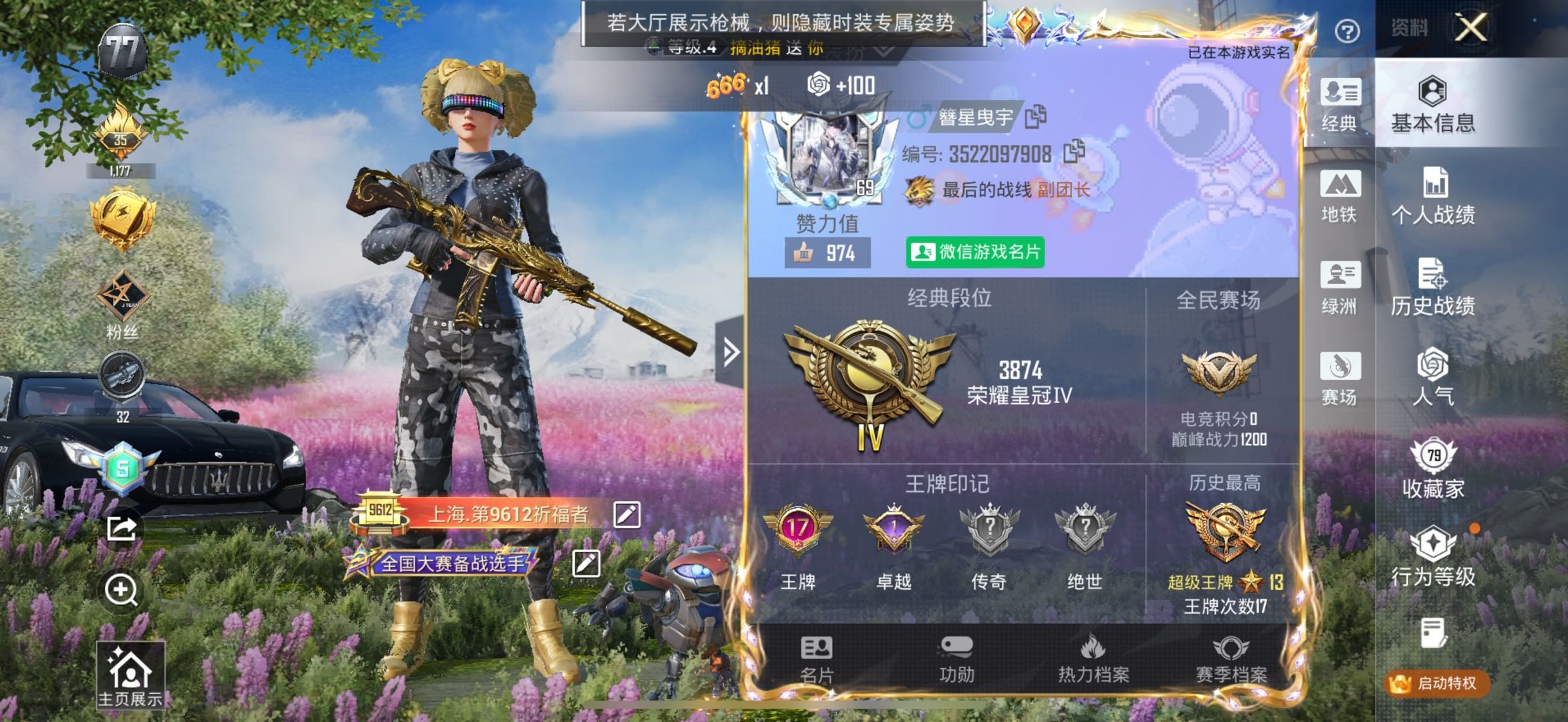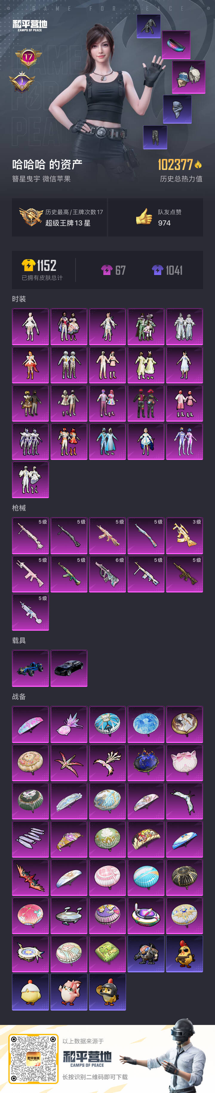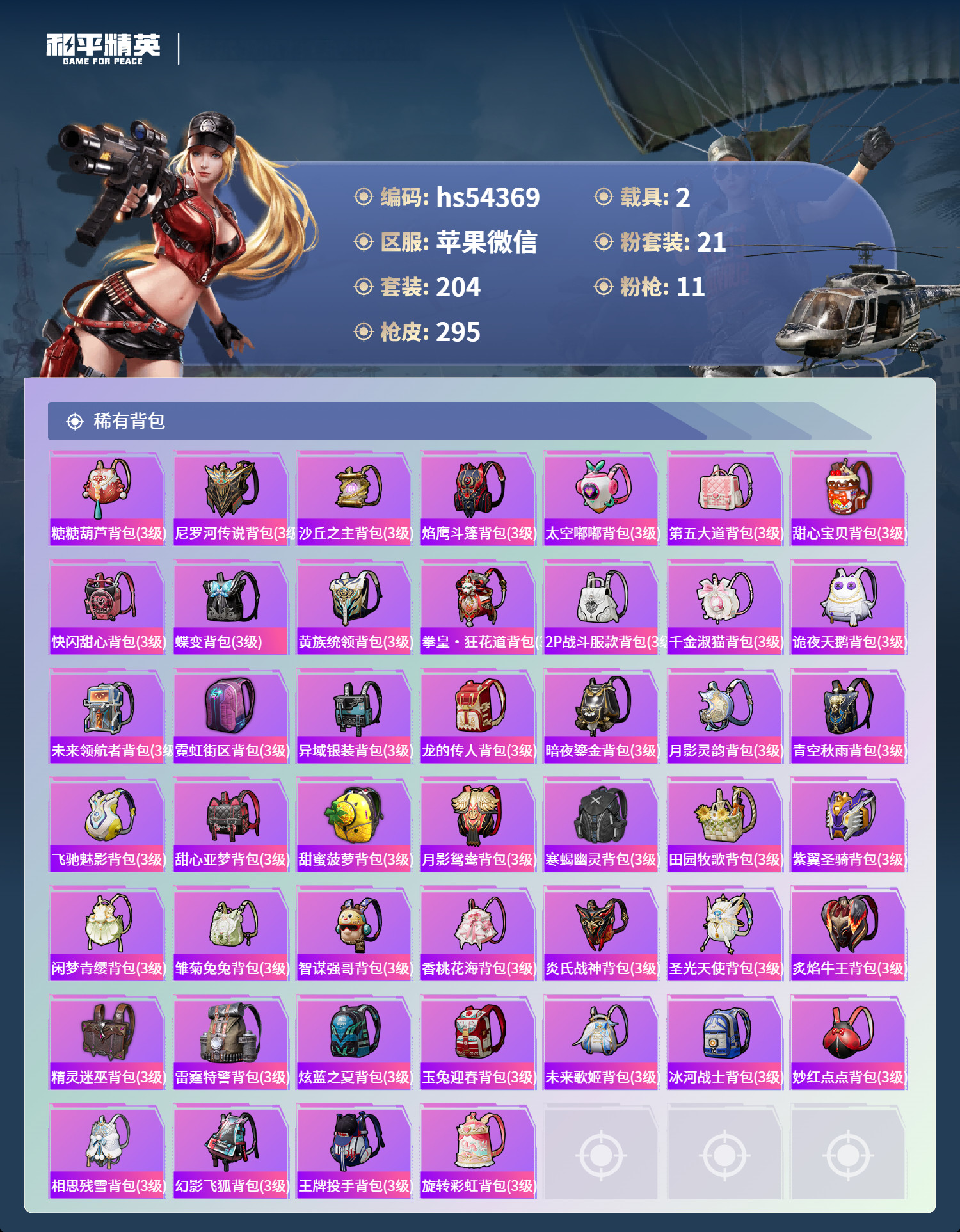 hs54369 苹果微-17王牌印记-21粉装-11特效枪-2载具-102377热力值-204套装