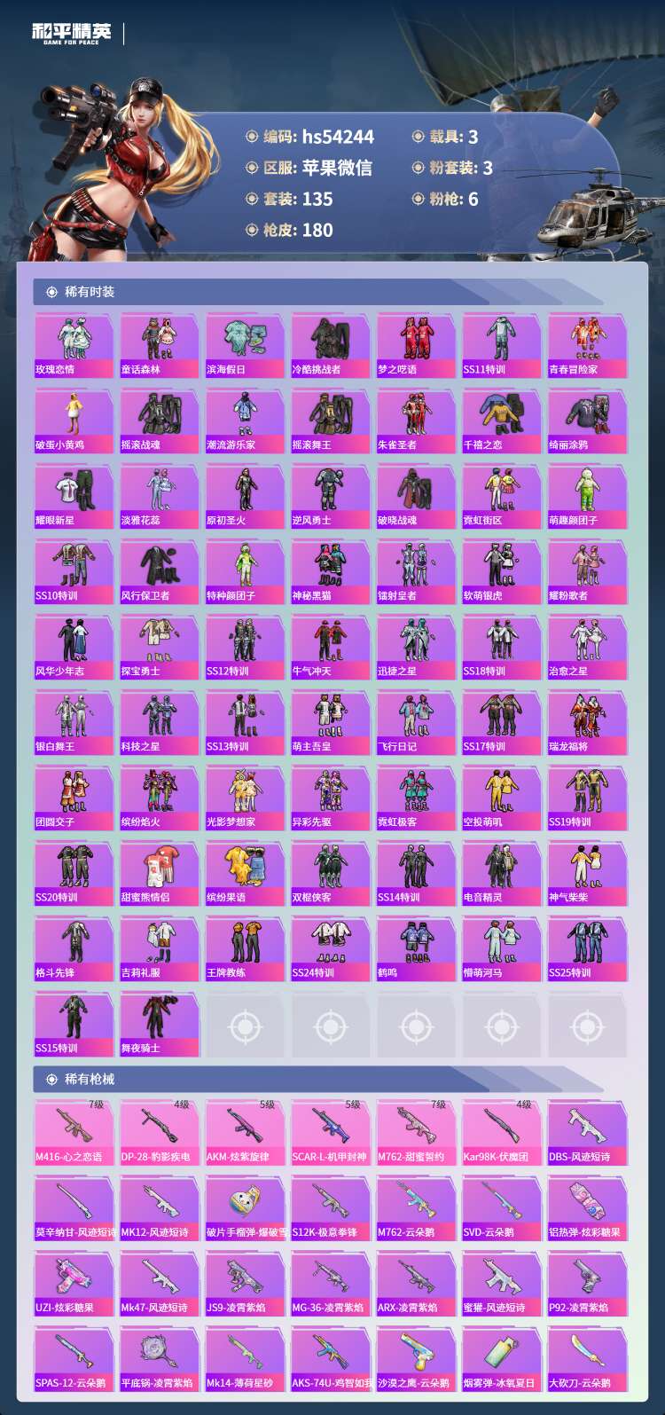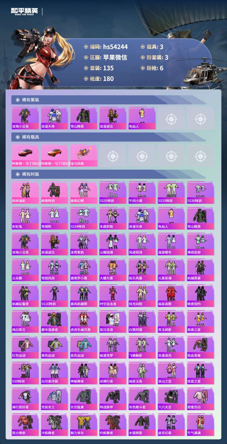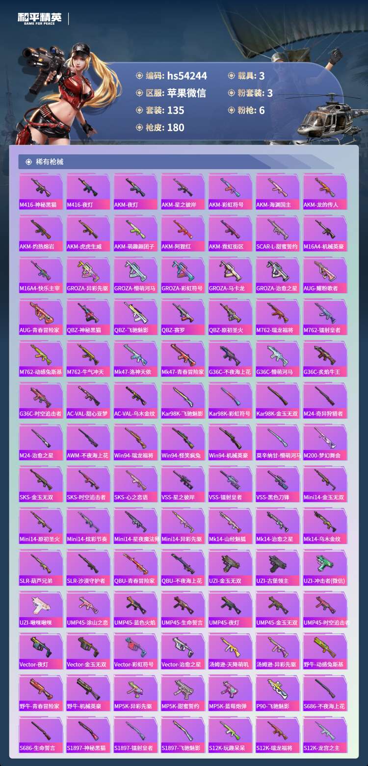 hs54244 苹果微-14王牌印记-3粉装-6特效枪-3载具-64532热力值-135套装-18