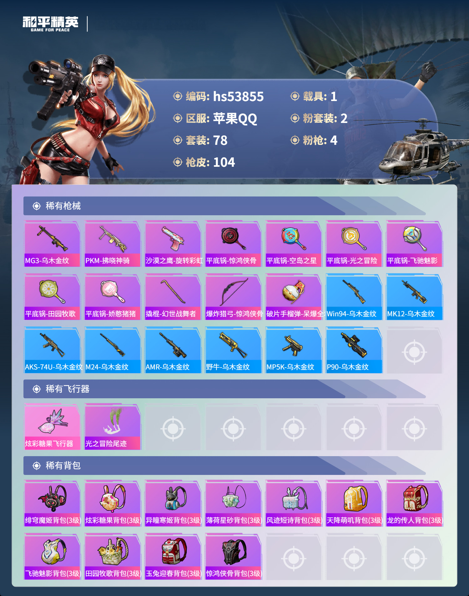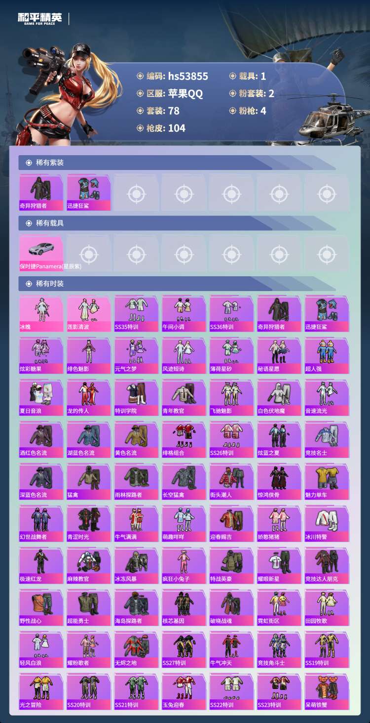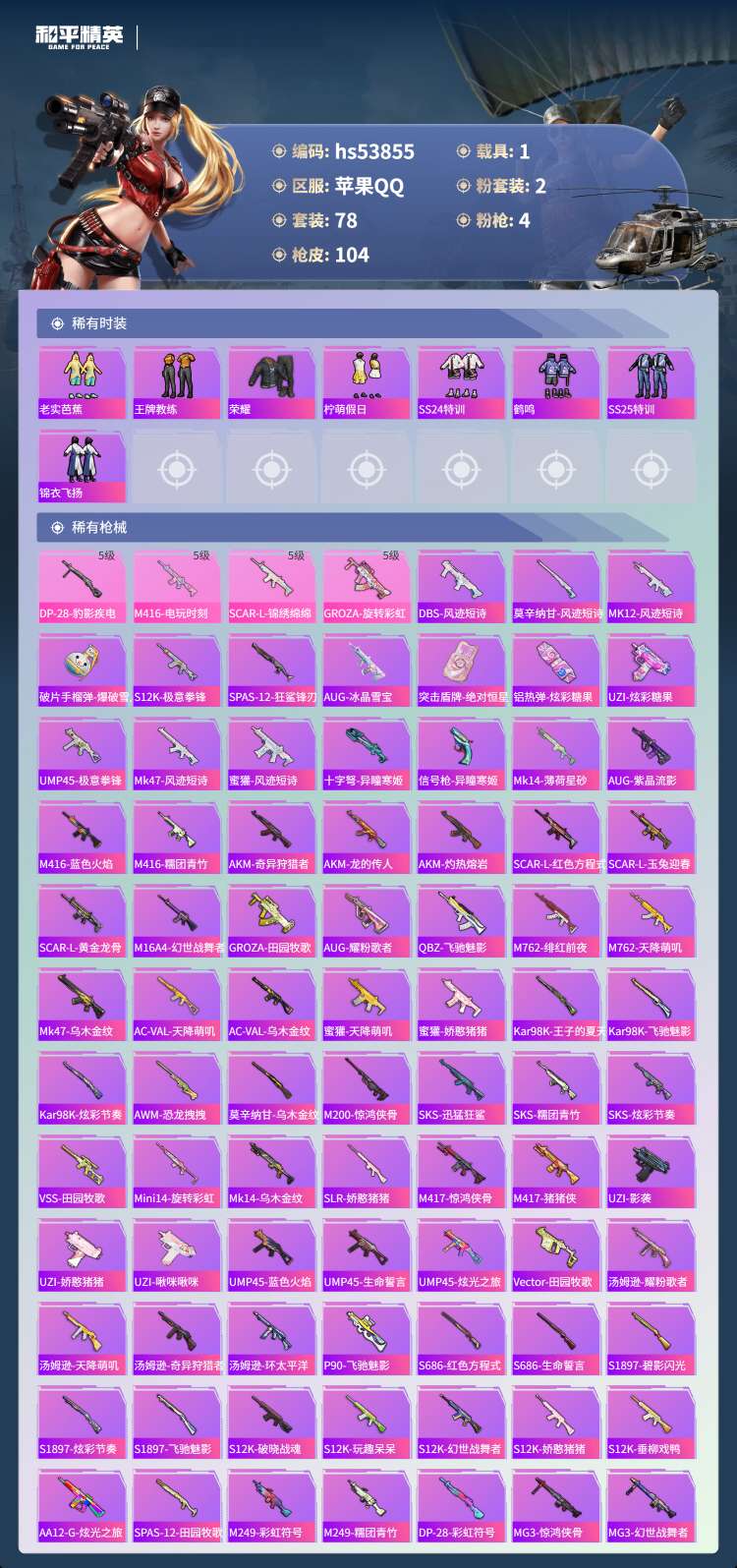 hs53855 苹果手Q-2王牌印记-2粉装-4特效枪-1载具-30200热力值-78套装-104枪