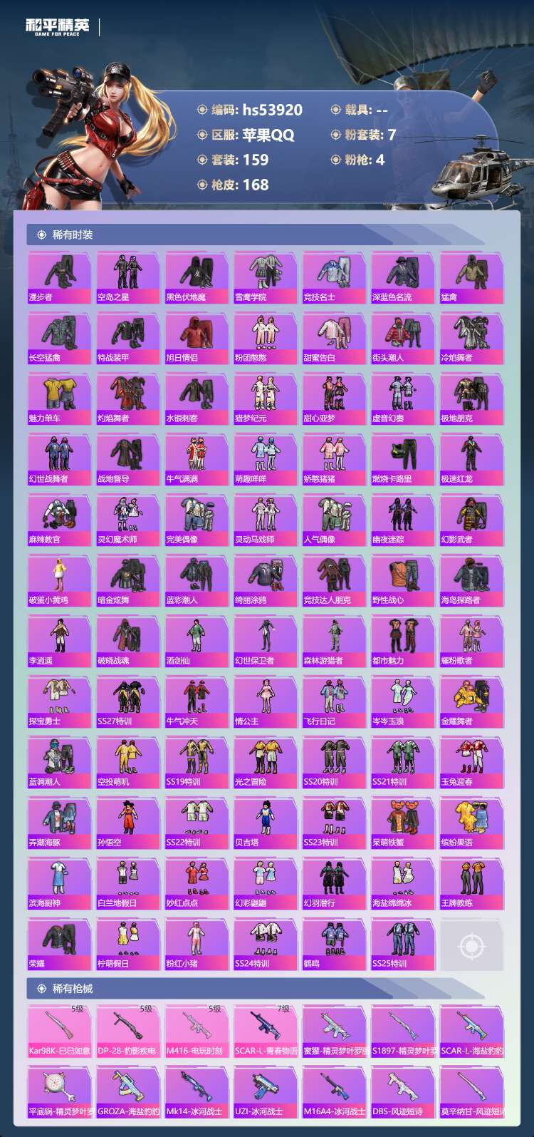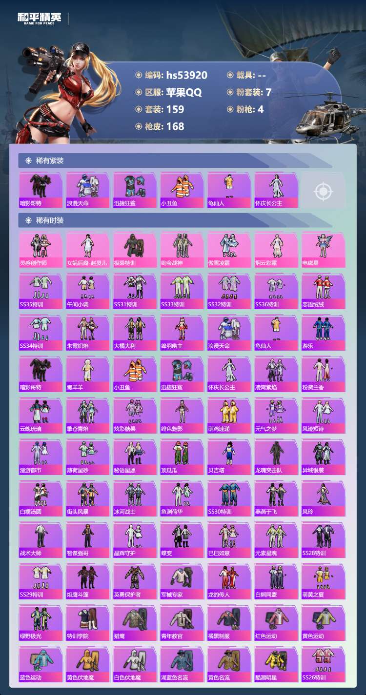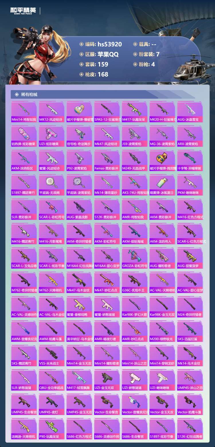 hs53920 苹果手Q-14王牌印记-有战神框-7粉装-4特效枪-54067热力值-159套装-1