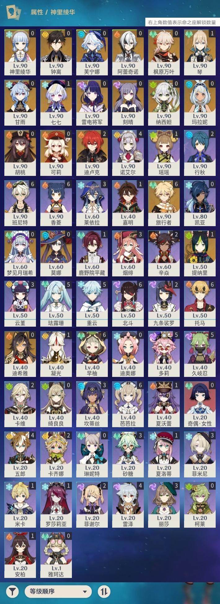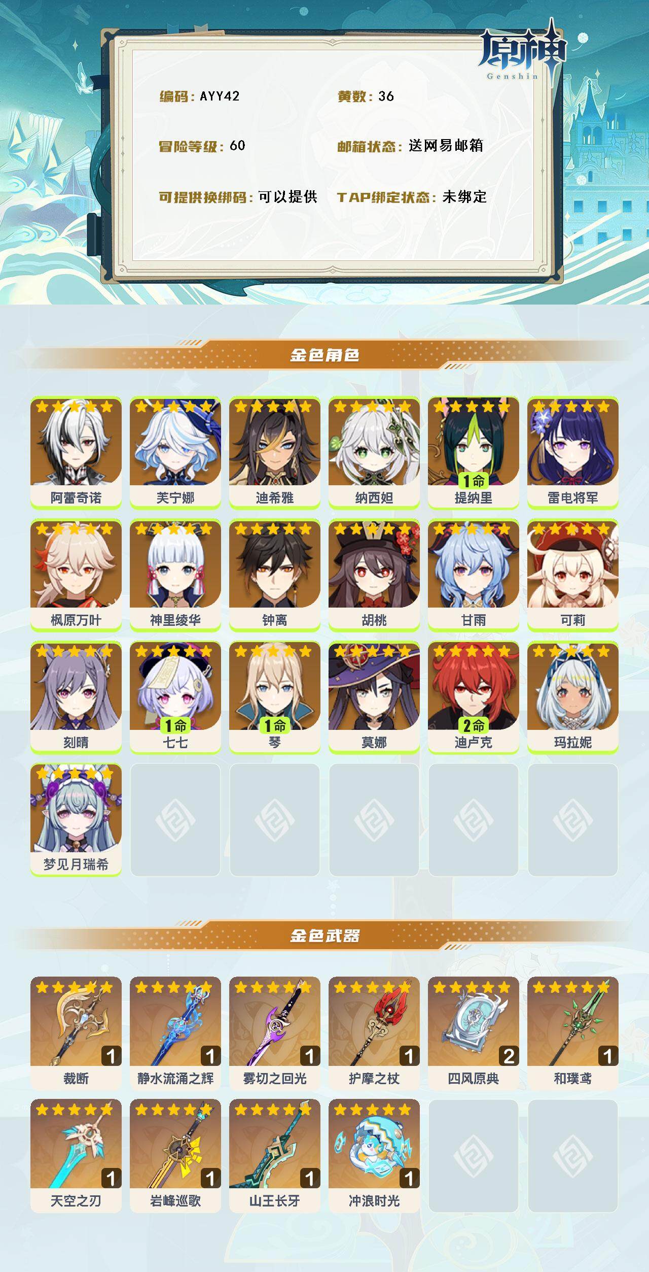 60级/36黄/男主/19个五星角色/11个五星武器0命阿蕾奇诺,0命芙宁娜