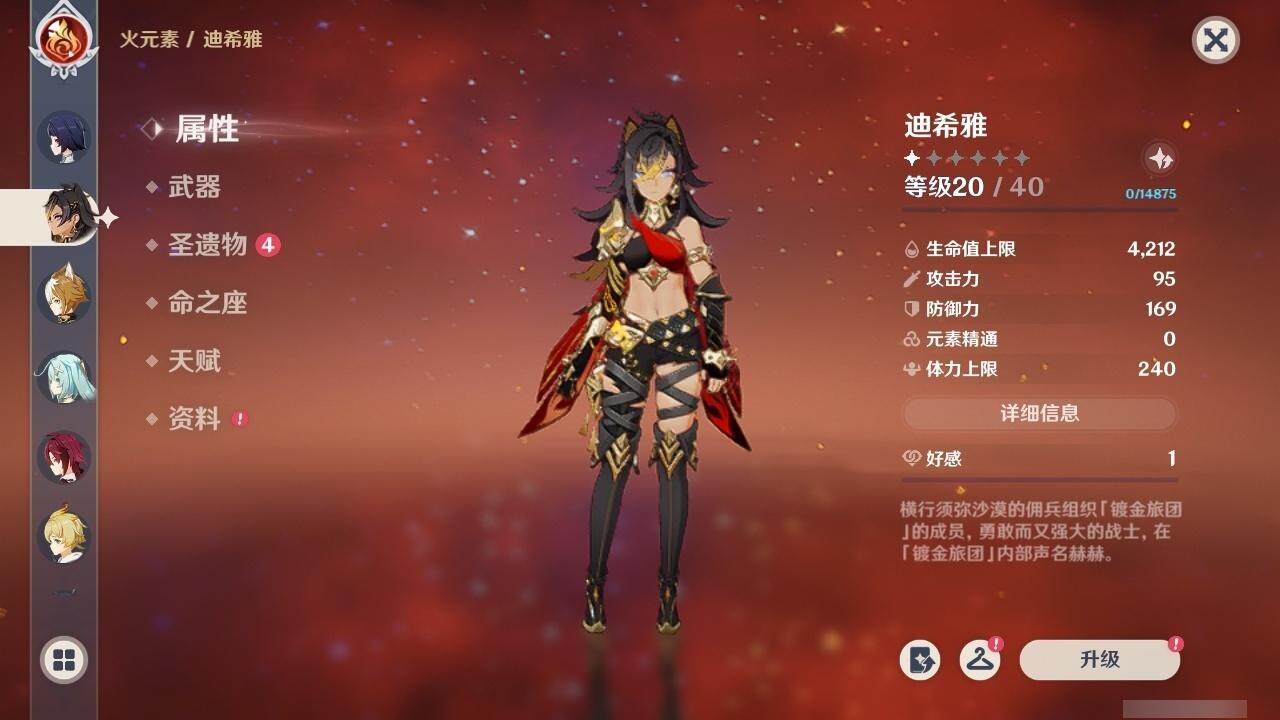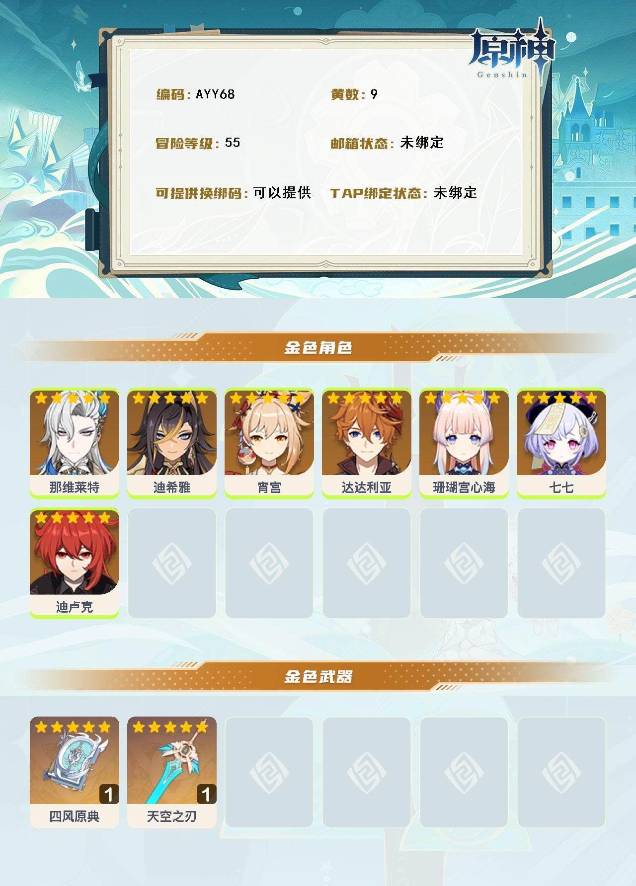55级/9黄/女主/7个五星角色/2个五星武器0命那维莱特,0命迪希雅,0命
