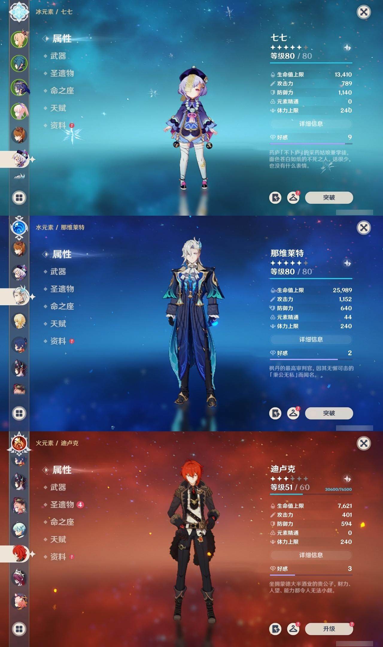 0命那维莱特,0命迪希雅,0命宵宫,0命达达利亚,0命珊瑚宫心海,0命七七,0命迪卢克,精1四风原典,精1天空之刃