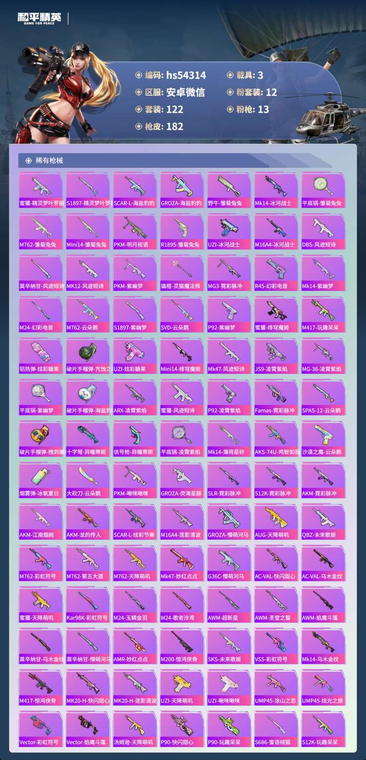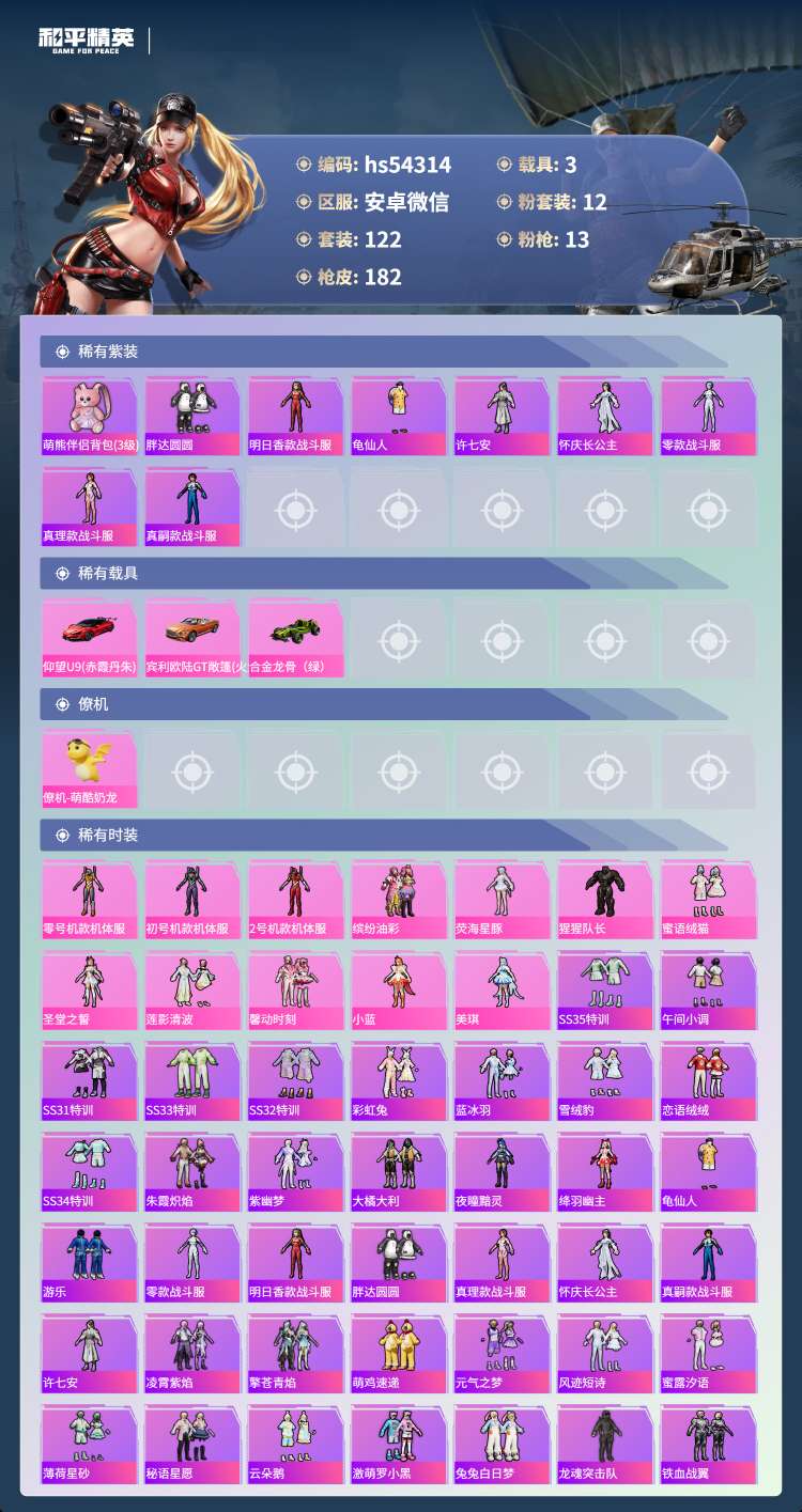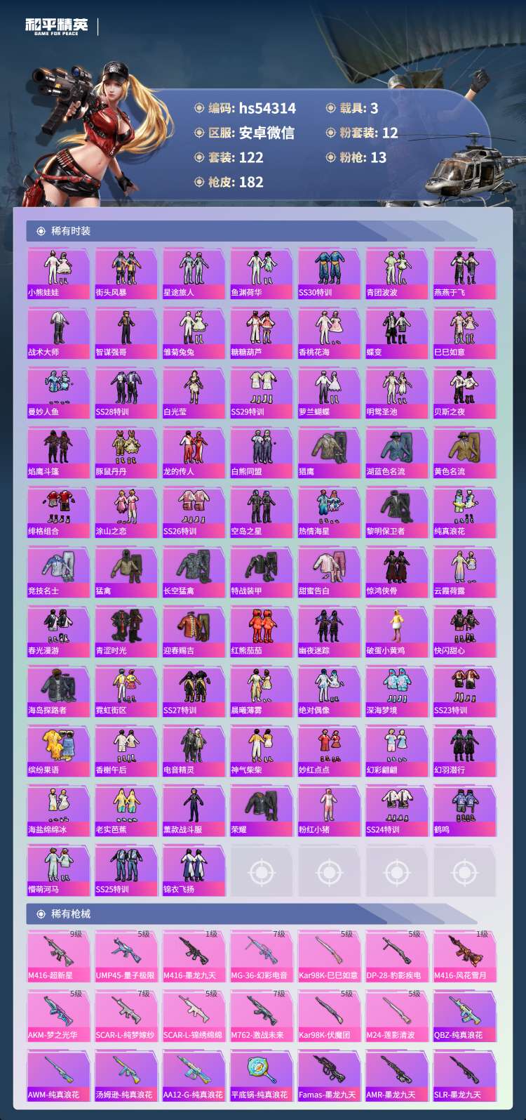 hs54314 安卓微-11王牌印记-12粉装-13特效枪-3载具-73398热力值-122套装-