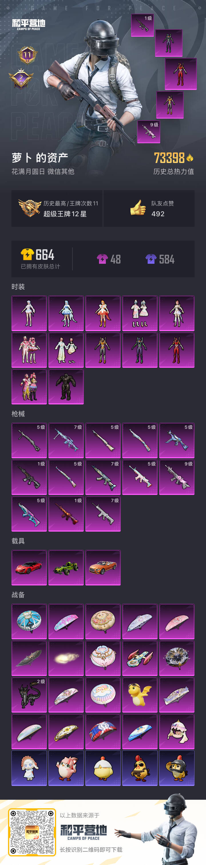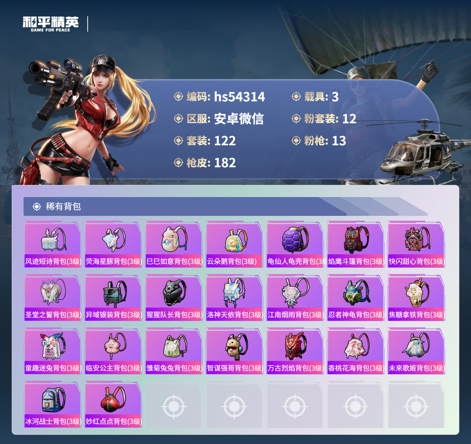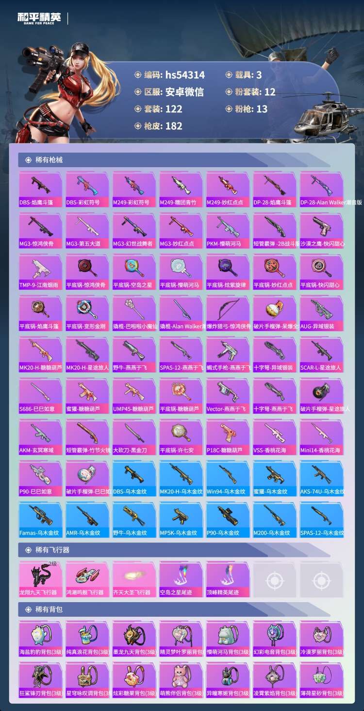 hs54314 安卓微-11王牌印记-12粉装-13特效枪-3载具-73398热力值-122套装-