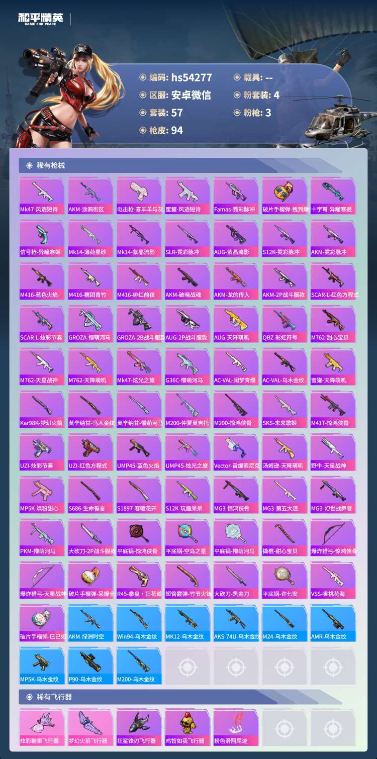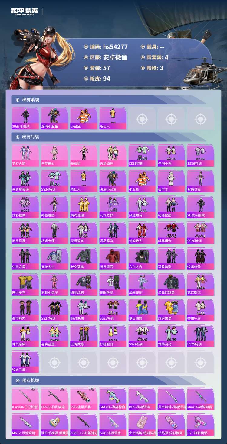 hs54277 安卓微-2王牌印记-4粉装-3特效枪-27217热力值-57套装-94枪皮【4粉装