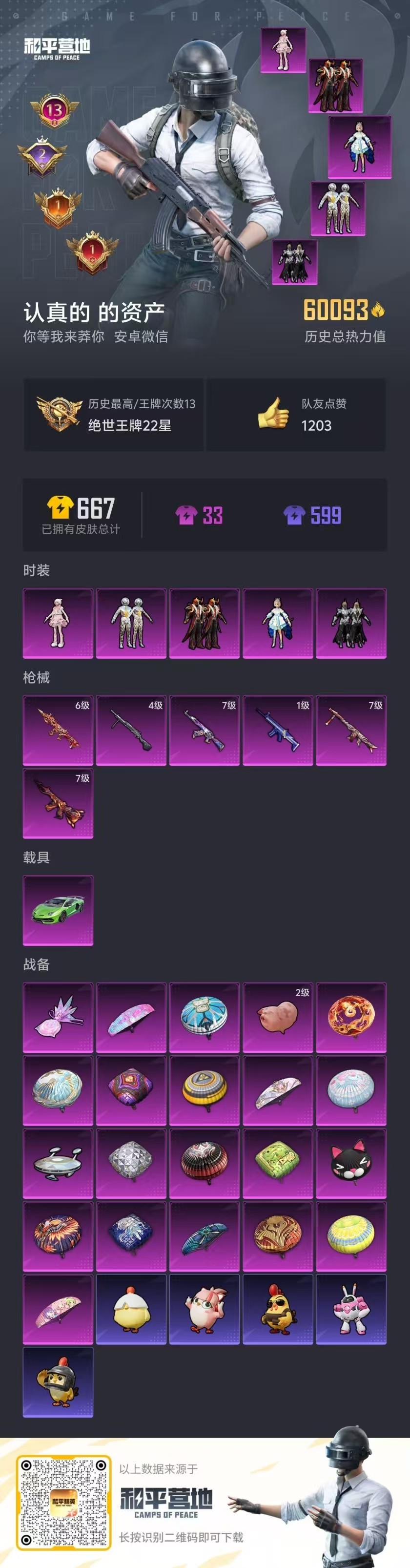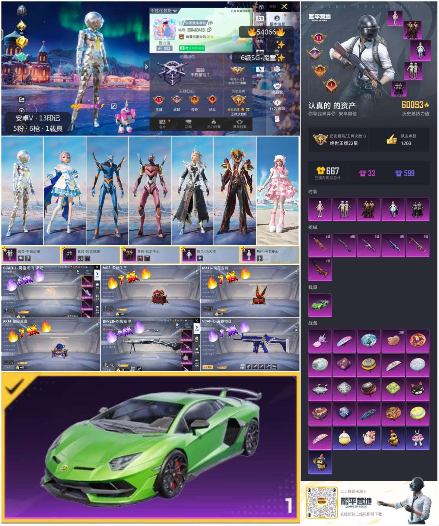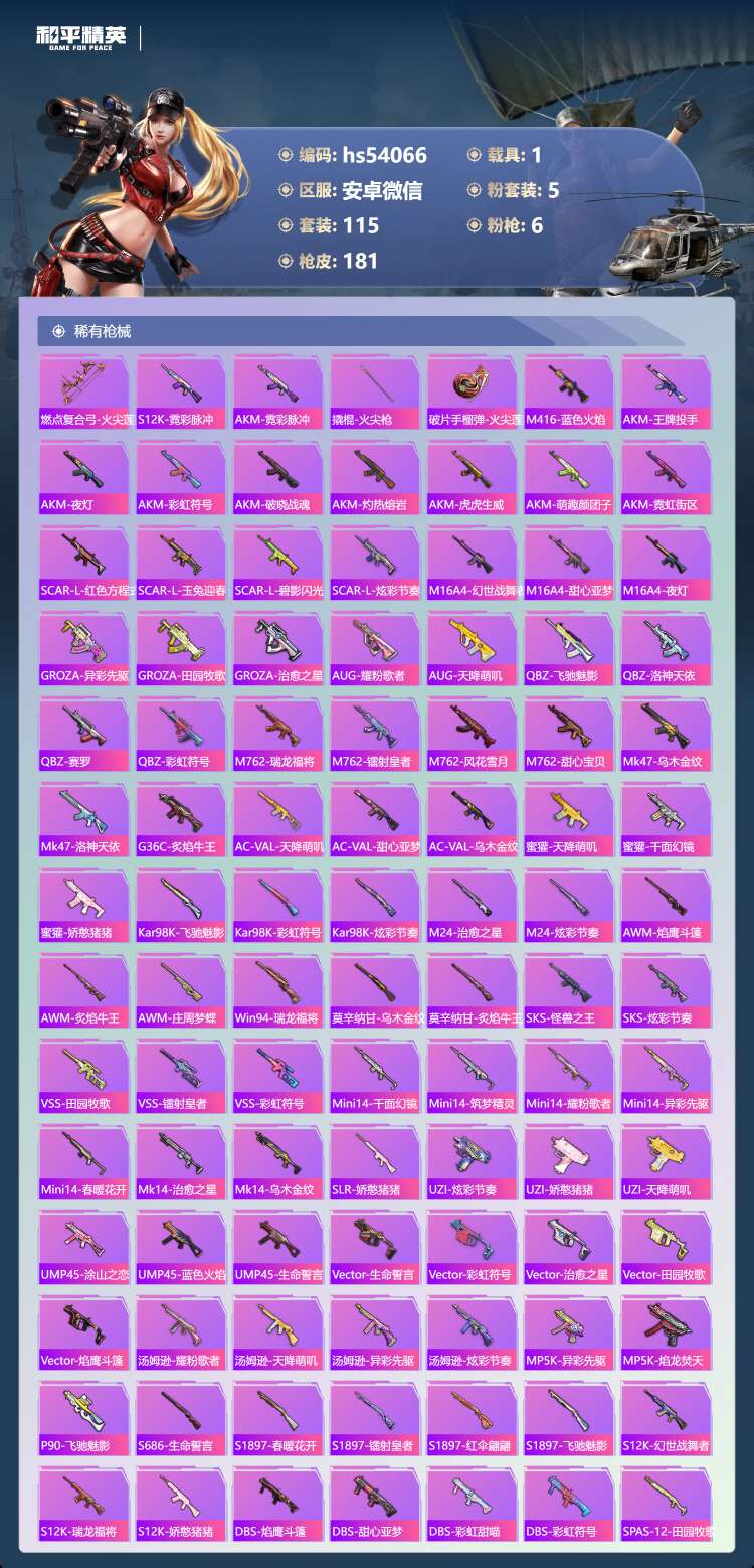 hs54066 安卓微-13王牌印记-5粉装-6特效枪-1载具-60108热力值-115套装-18