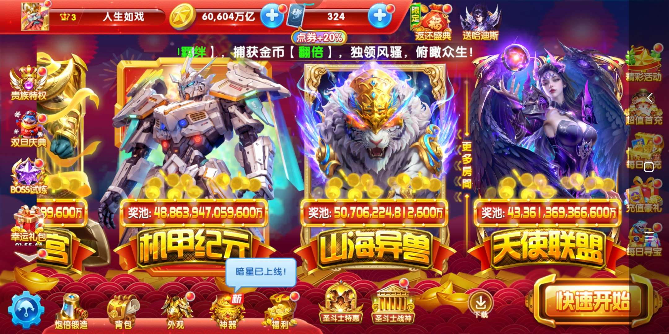 超能两天,刀手出战,捕鱼大作战小米版金币6兆,实炮倍10000万炮,巅峰3.5倍,带号出