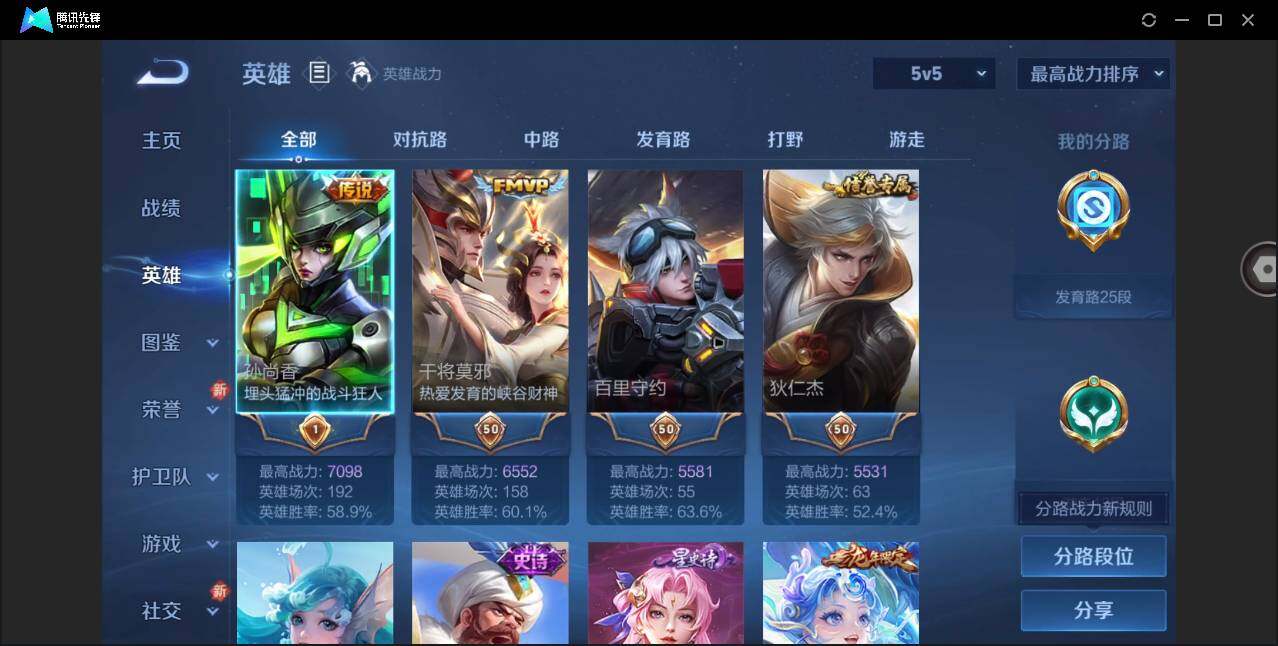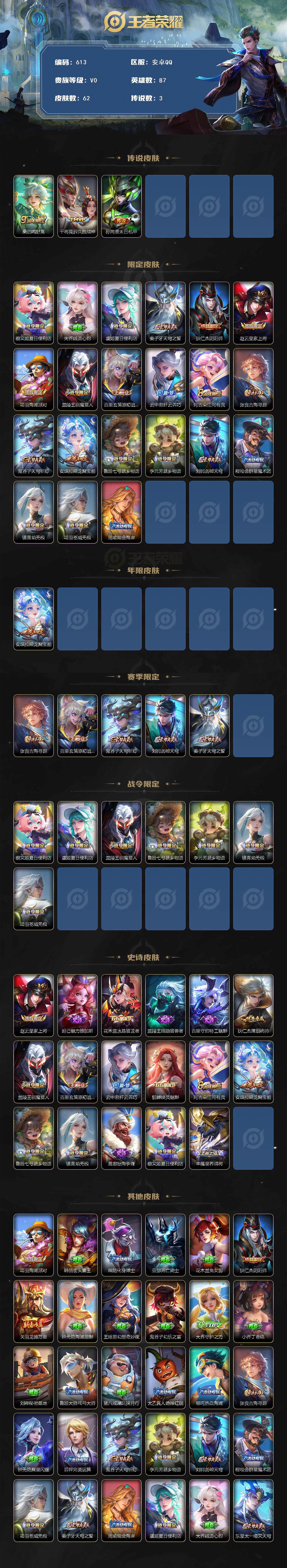 1821509 王者荣耀账号 安卓Q-V0-荣耀黄金II段位-87英雄-62皮肤-3传说-17史诗