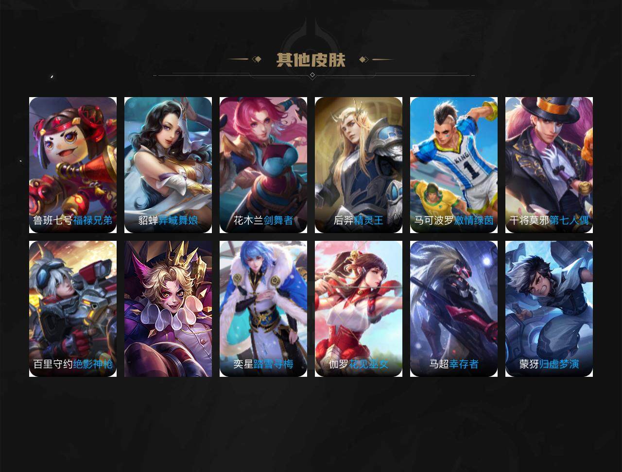 【限定皮肤】:蔡文姬夏日便利店,大乔绒语心约,虞姬夏日便利店,姜子牙天穹之誓,狄仁杰阴阳师,赵云皇家上将,项羽海滩派对,兰陵王驯魔猎人,百里玄策原初追逐者,云中君纤云弄巧,阿古朵江河有灵,张良古海寻踪,鬼谷