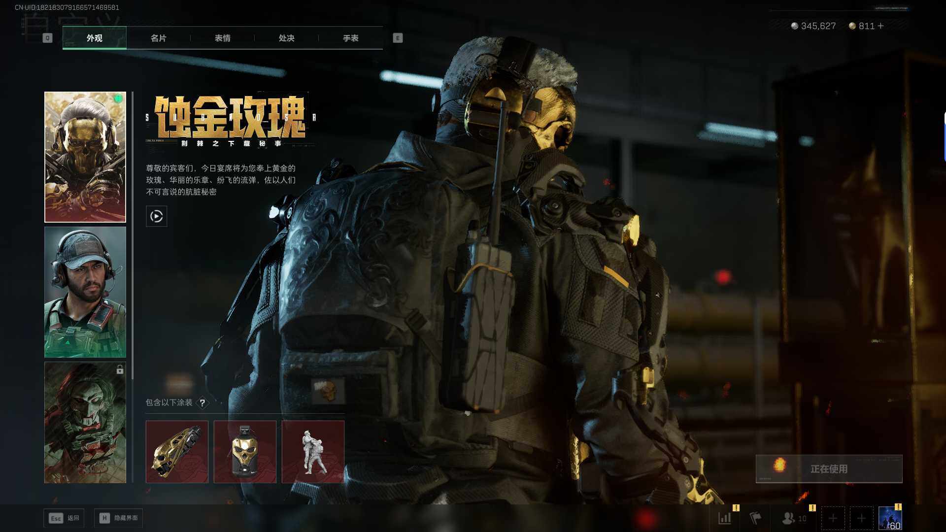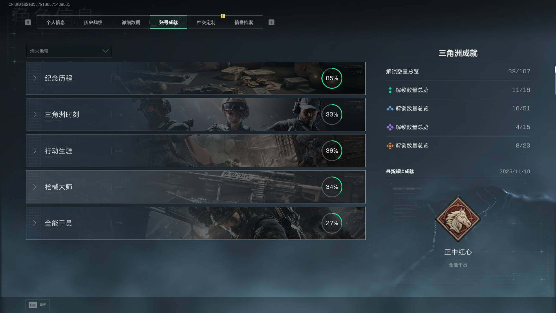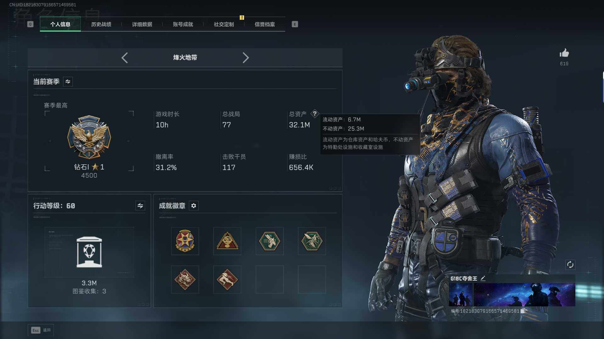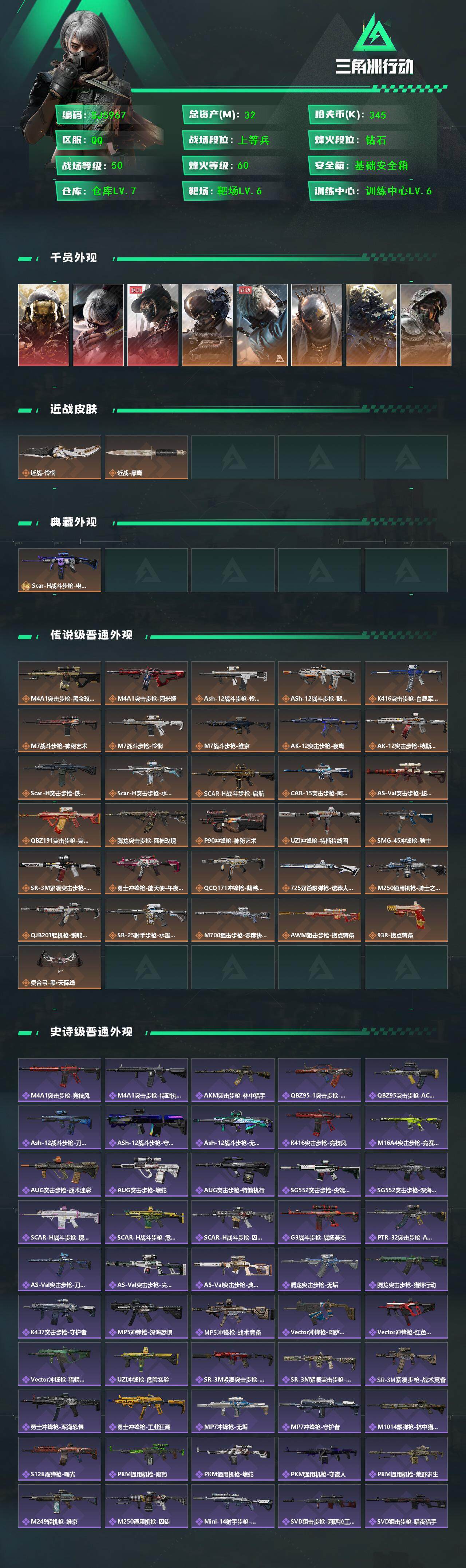 总资产(M):32M/哈夫币(K):345K/传说枪皮数:32/全面战场等级:50_段位:上等兵/烽火地带等级:60_段位:钻石/