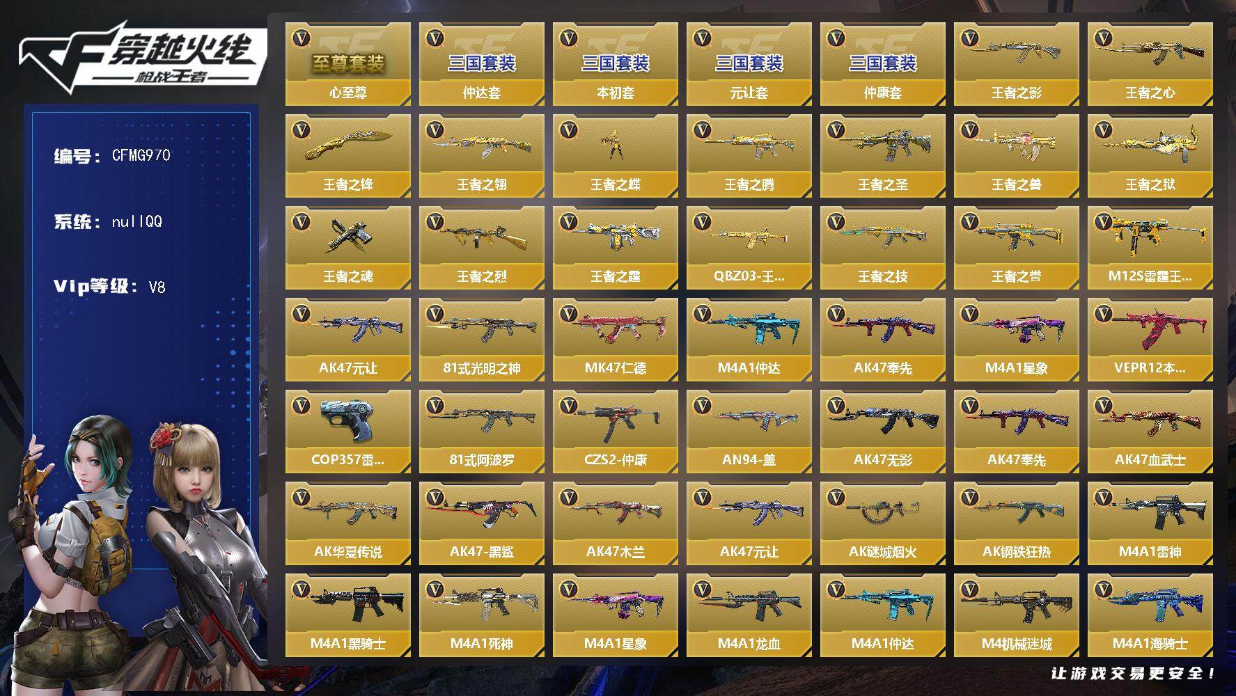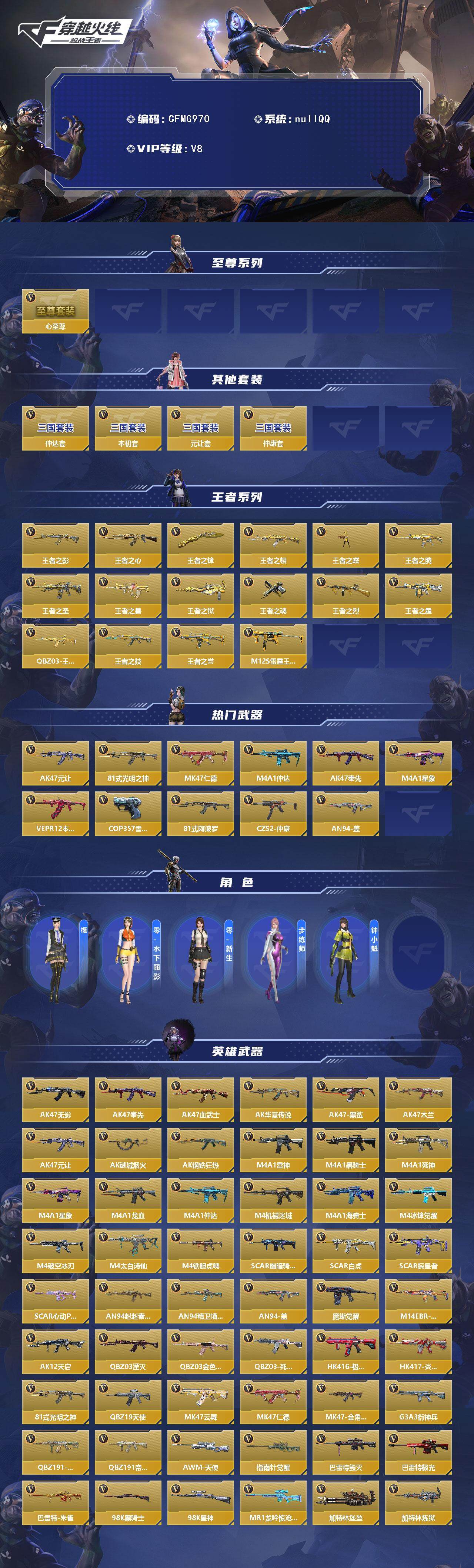 【CFMG970】VIP8/211V/心至尊/元让套/仲达套/仲康套/本初套/王者之影/王者之心/王者之锋/王者之翎/王者之蝶/王者之腾/王者之圣/王者之兽/王者之狱/王者之魂/王者之烈/王者之霆/QBZ03-王者蔷薇/王者之技/王者之誉/M12S-雷霆王者/AK47-元让/81式-光明之神/MK47-仁德/M4A1-仲达/AK47-奉先/M4A1-星象/VEPR12-本初/COP 357-雷霆/81式-阿波罗/CZS2-仲康/AN94-盖/樱/零水下丽影/零-新生/步练师/钟小魁/AK47-无