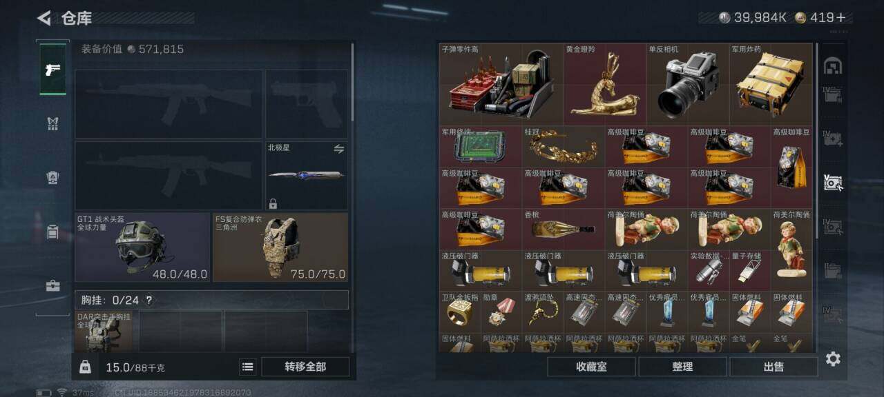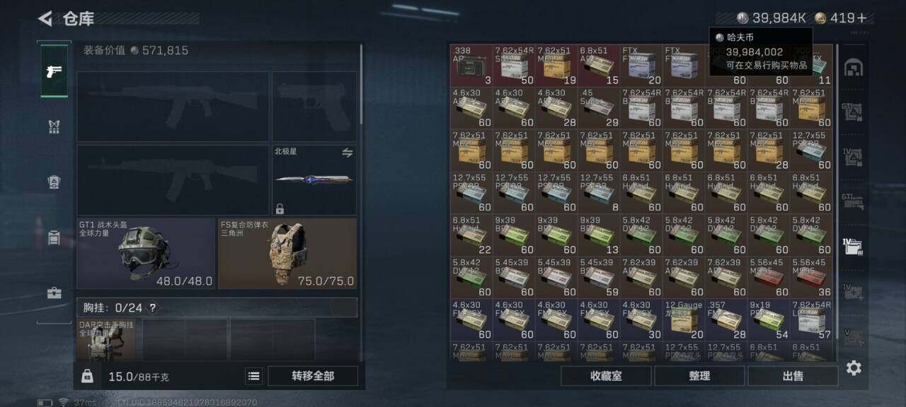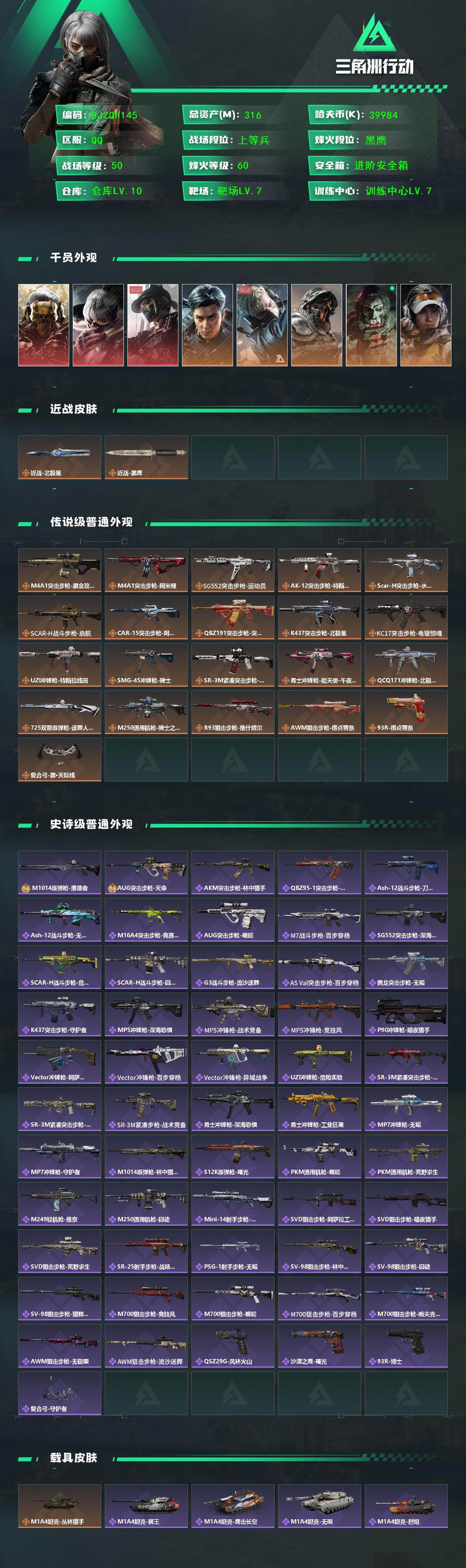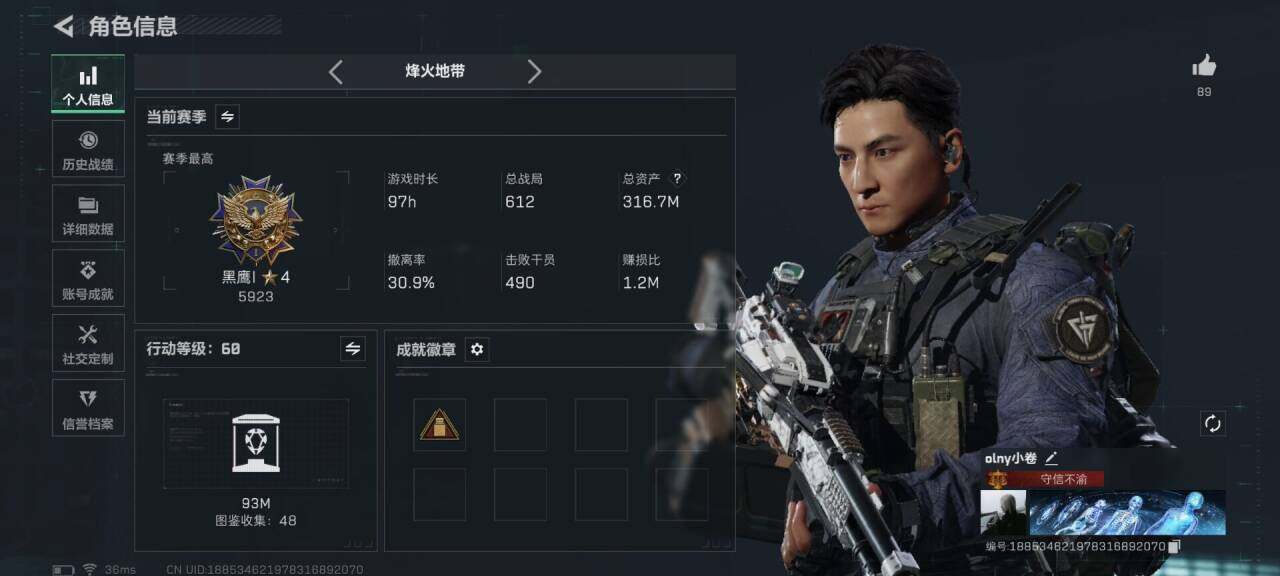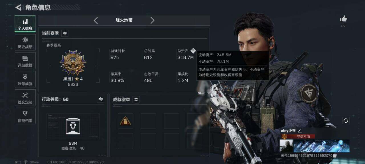 总资产(M):316M/哈夫币(K):39984K/全面战场等级:50_段位:上等兵/烽火地带等级:60_段位:黑鹰