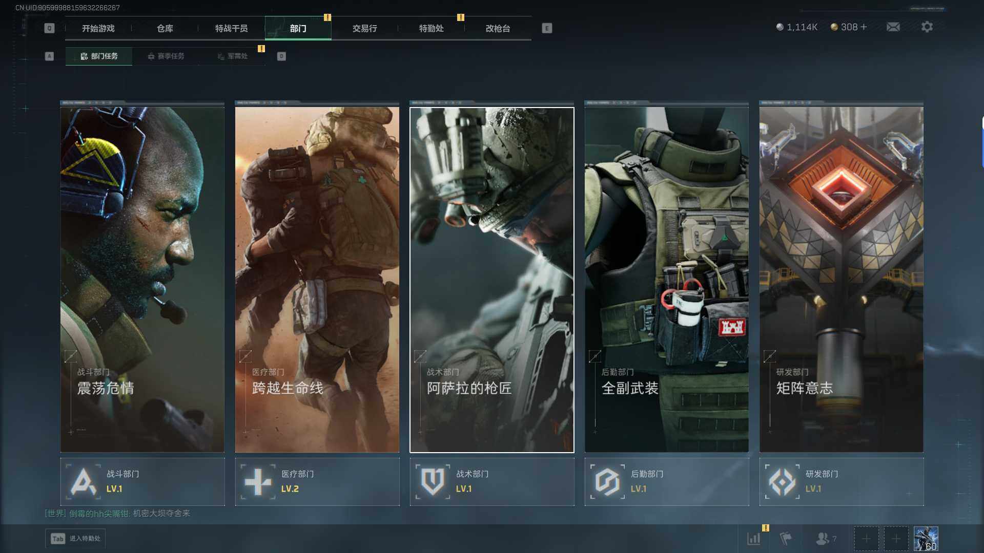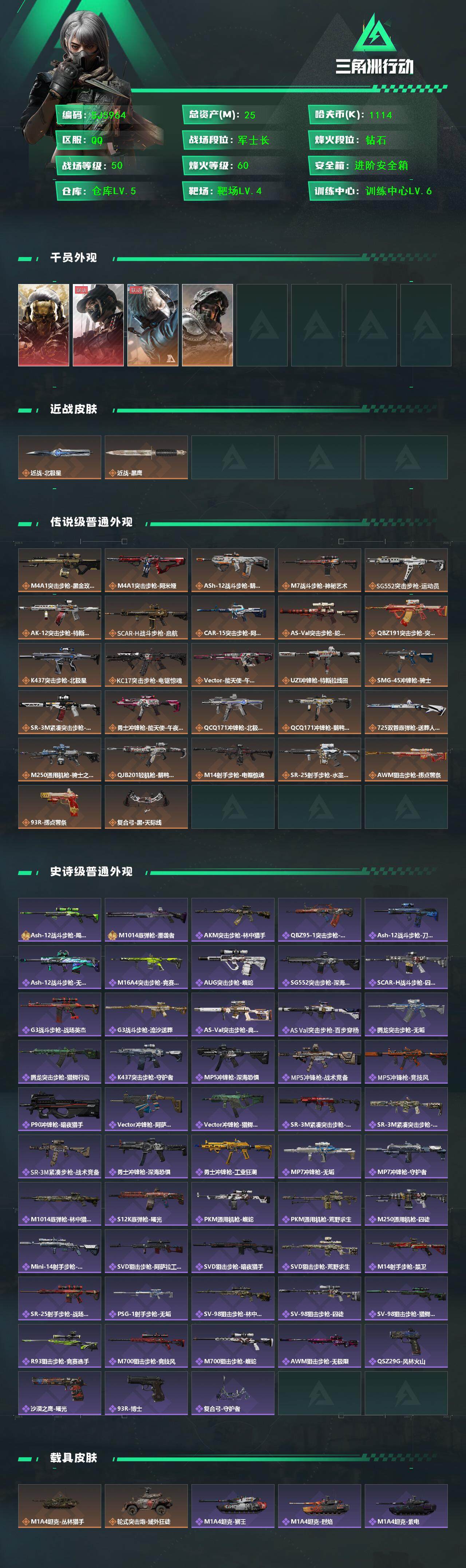 总资产(M):25M/哈夫币(K):1114K/ 传说枪皮数:20/全面战场等级:50_段位:军士长/烽火地带等级:60_段位:钻石