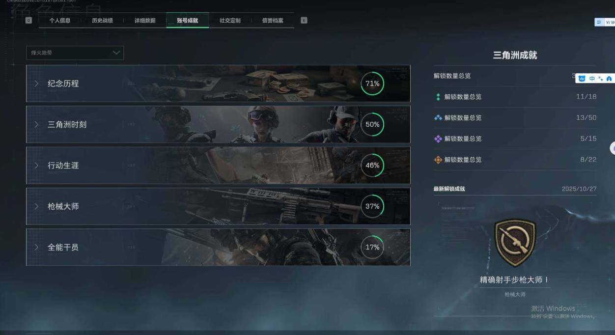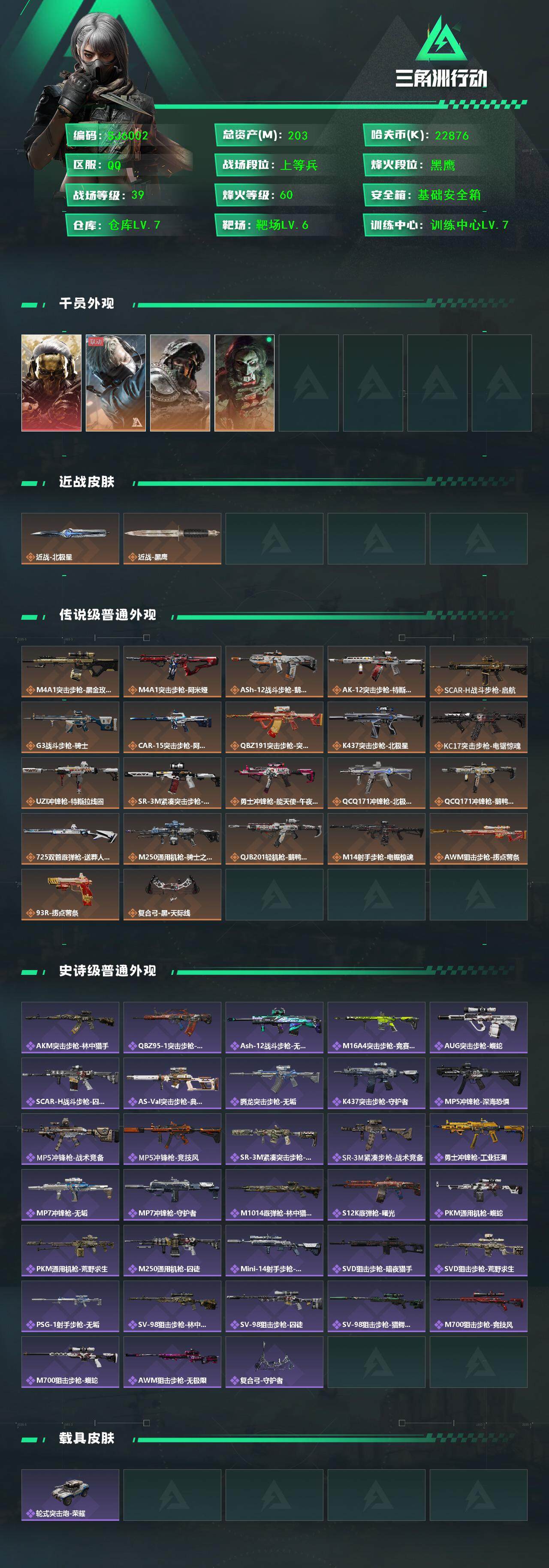 总资产(M):203M/哈夫币(K):22876K/ 全面战场等级:39_段位:上等兵/烽火地带等级:60_段位:黑鹰