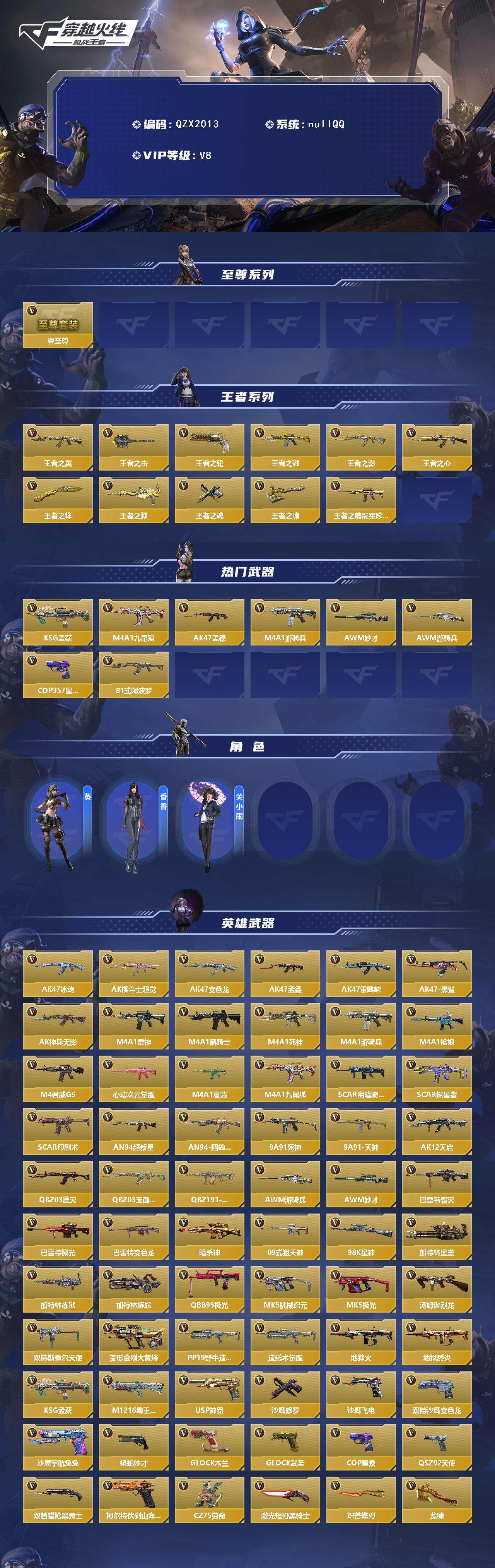 【QZX2013】VIP8/165V/翼至尊/王者之翼/王者之击/王者之轮/王者之戮/王者之影/王者之心/王者之锋/王者之狱/王者之魂/王者之啸/王者之魄冠军珍藏/KSG-孟获/M4A1-九尾狐/AK47-孟德/M4A1-游骑兵/AWM-妙才/AWM-游骑兵/COP 357-星象/81式-阿波罗/葵/香香/关小雨/AK47-冰魂/AK47-樱斗士-超觉/AK47-变色龙/AK47孟德/AK47-雷麒麟/AK47-黑鲨/AK47-神兵无影/M4A1-雷神/M4A1-黑骑士/M4A1-死神/M4A1