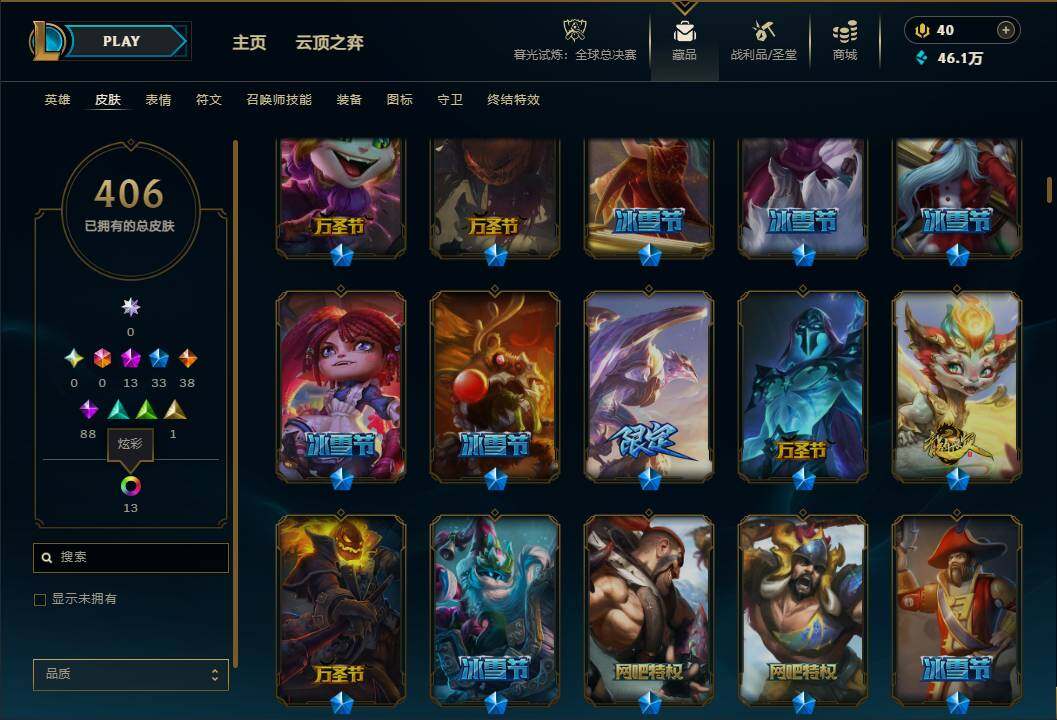 172英雄/406皮肤/13神话/33限定/11臻彩/29炫彩/38传说/88史诗/青铜账号等级:741/