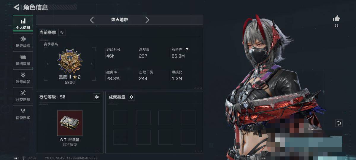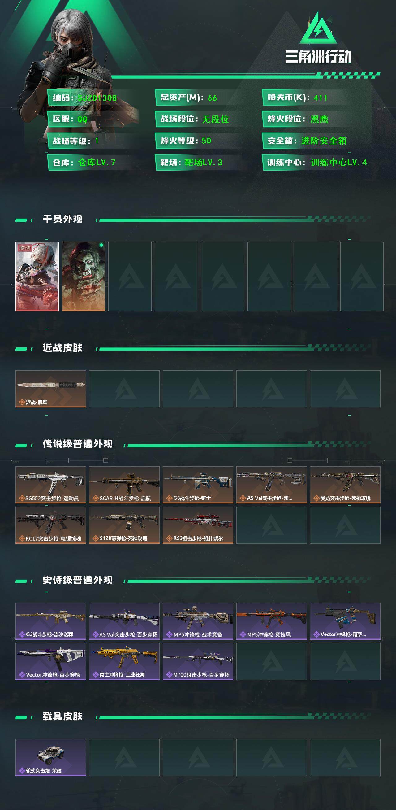 总资产(M):66M/哈夫币(K):411K/全面战场等级:1_段位:无段位/烽火地带等级:50_段位:黑鹰/