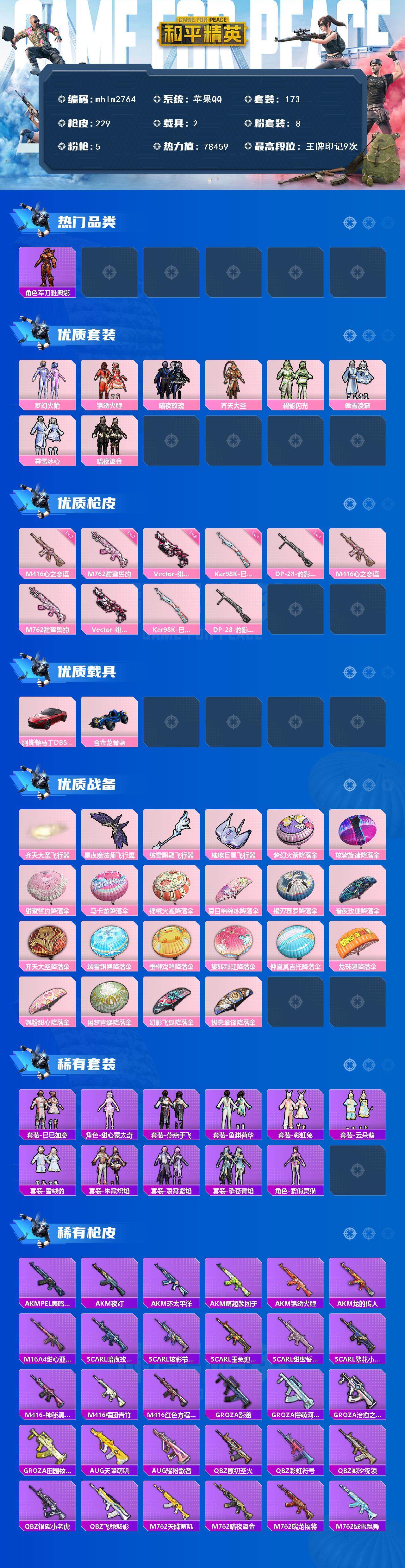 【mhlm2764】苹果,手Q-8粉装-5特效枪-2载具-4粉色飞行器-78459热力值-9王牌印记-173套装-229枪皮