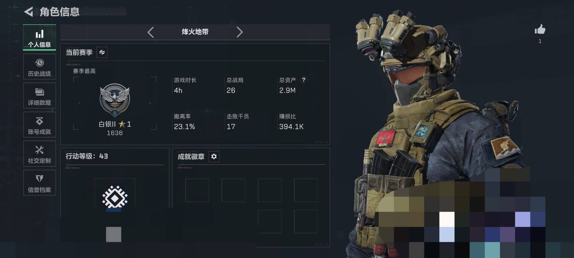 总资产(M):2M/哈夫币(K):76K/全面战场等级:1_段位:无段位/烽火地带等级:43_段位:白银/