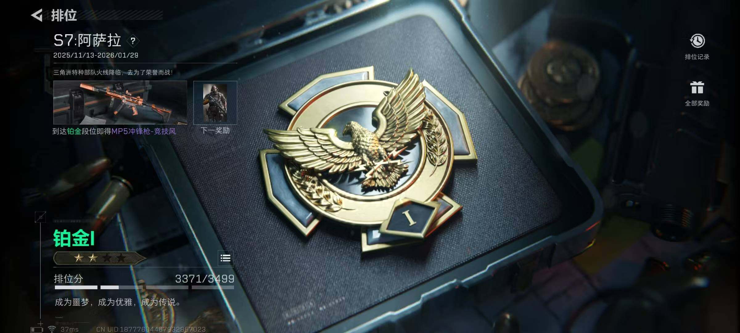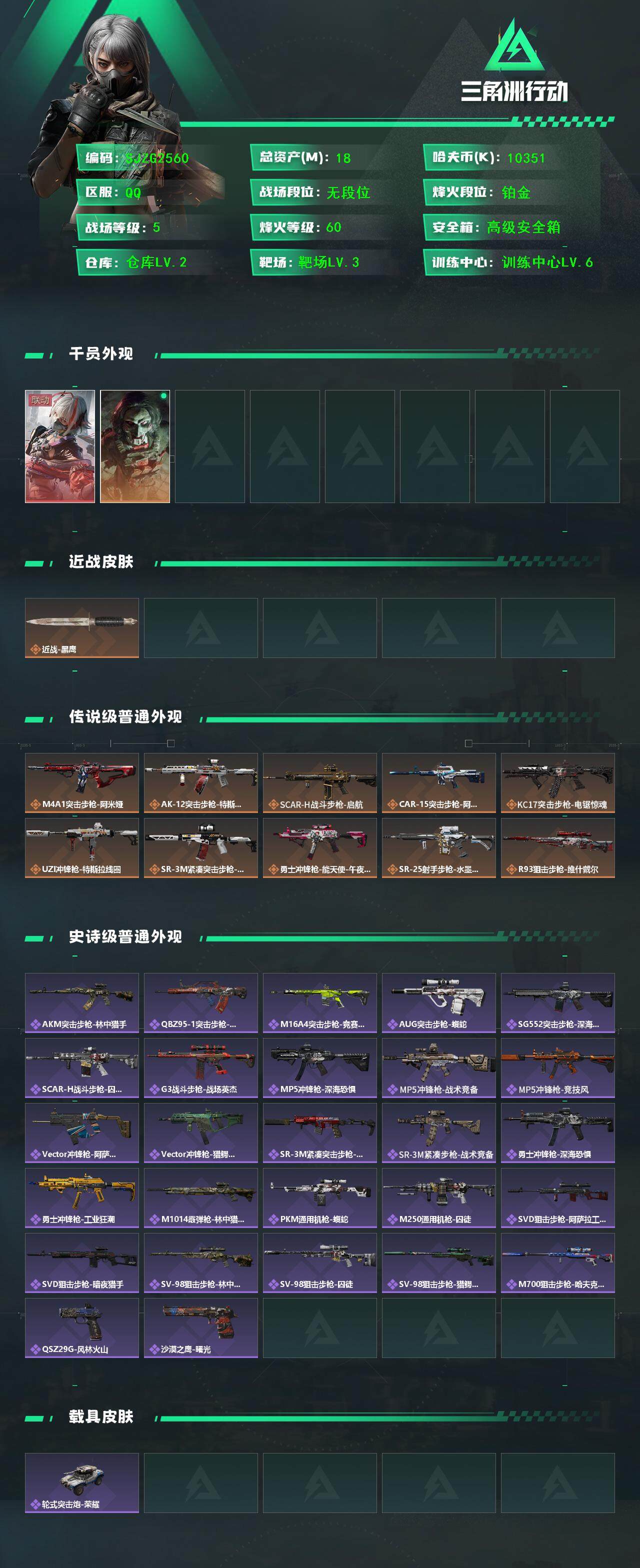 总资产(M):18M/哈夫币(K):10351K/传说枪皮数:10/全面战场等级:5_段位:无段位/烽火地带等级:60_段位:铂金/