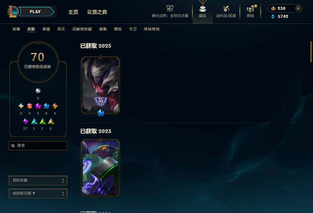 116英雄/70皮肤/3神话/6限定/1臻彩/4炫彩/4传说/27史诗/黑铁/